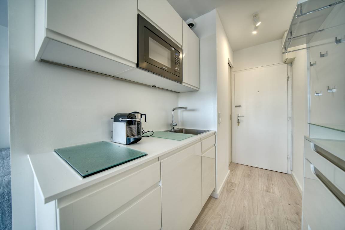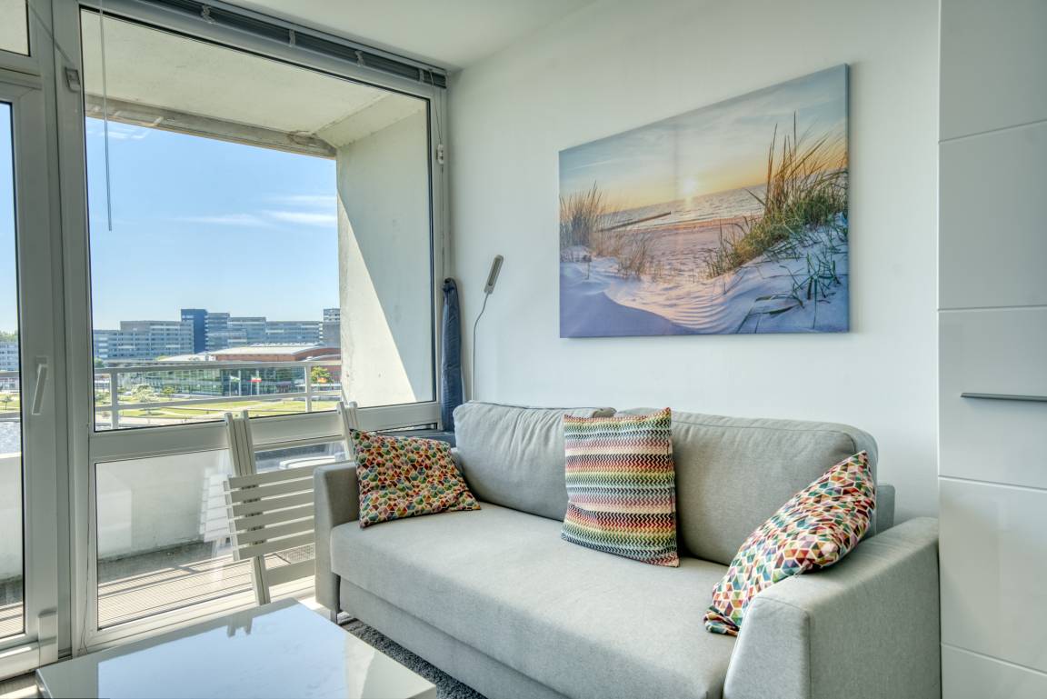 Der Wohn-Schlafraum ist mit einem bequemen Doppelbett ausgestattet. Vom Balkon genießen Sie den Blick auf die Binnensee. WLAN und eine Fußbodenheizung sorgen ganzjährig für zusätzlichen Wohnkomfort.