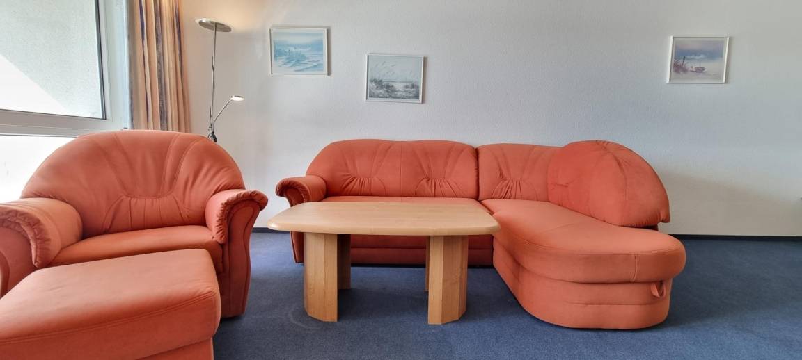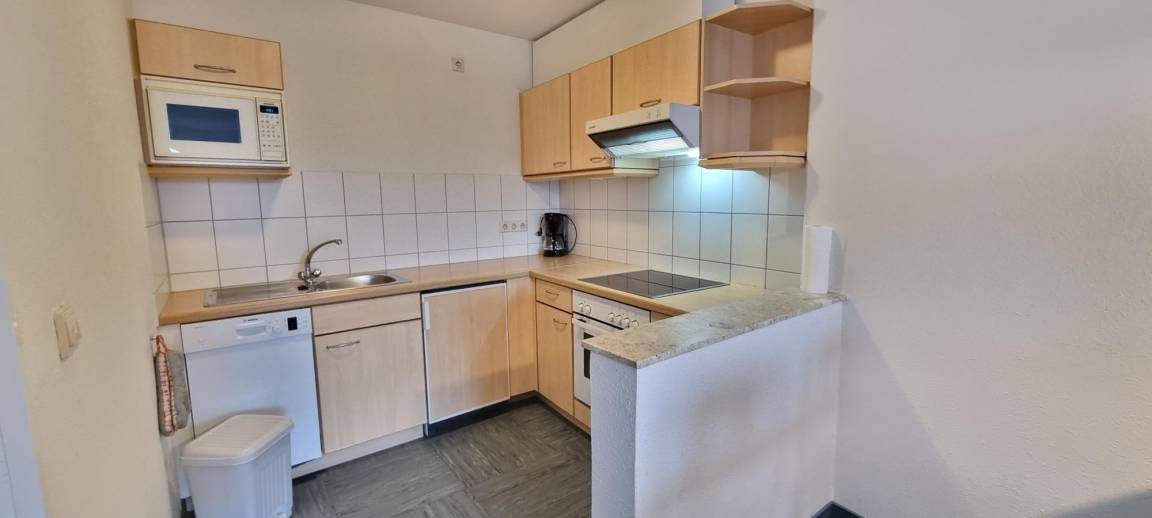 Das separate Schlafzimmer ist mit einem gemütlichen Doppelbett und großem Kleiderschrank ausgestattet, sodass Sie erholsame Nächte genießen können. Im hellen Wohnbereich finden Sie eine offene Küchenzeile mit Esstisch – ideal für die Selbstverpflegung während Ihres Urlaubs. Für zusätzliche Gäste steht eine Schlafcouch im Wohnzimmer zur Verfügung.