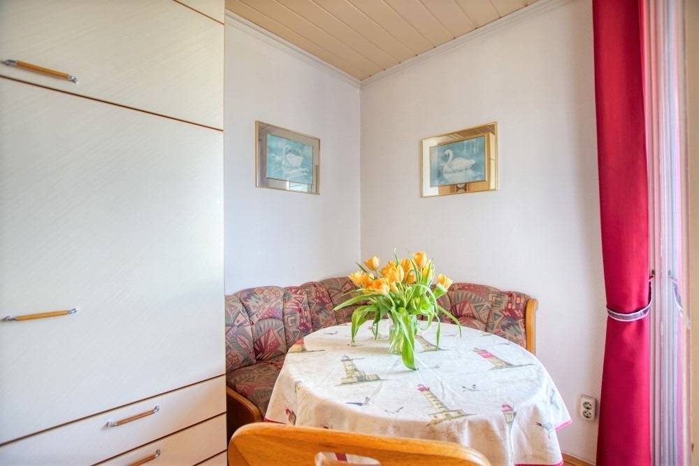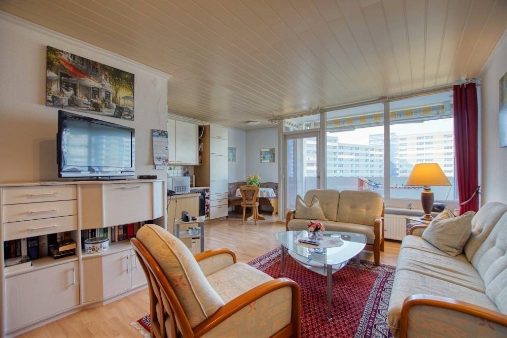 Wohn-/Schlafbereich mit zwei Einzelbetten, Sofa, Sessel, gemütlicher Sitzecke und Flachbild-TV. Voll ausgestattete Küche mit Ceranherd, Backofen, Mikrowelle, Geschirrspüler, Kühlschrank mit Gefrierfach, Wasserkocher, Toaster und Filterkaffeemaschine. Bad mit Dusche, WC und Handtuchtrockner. Bonus: kostenfreies WLAN, Fahrstuhl, Fahrradräume, ca. 300 m bis zum Strand, kostenloser Parkplatz. Nichtraucherwohnung, keine Haustiere.