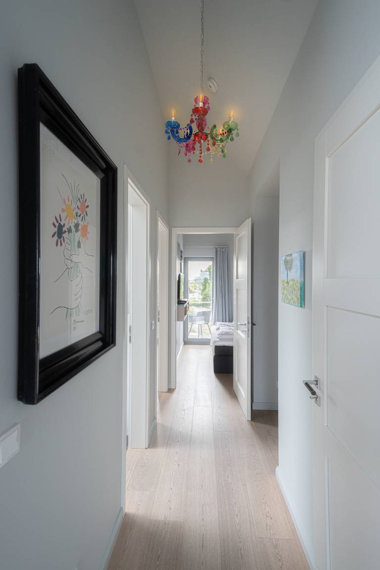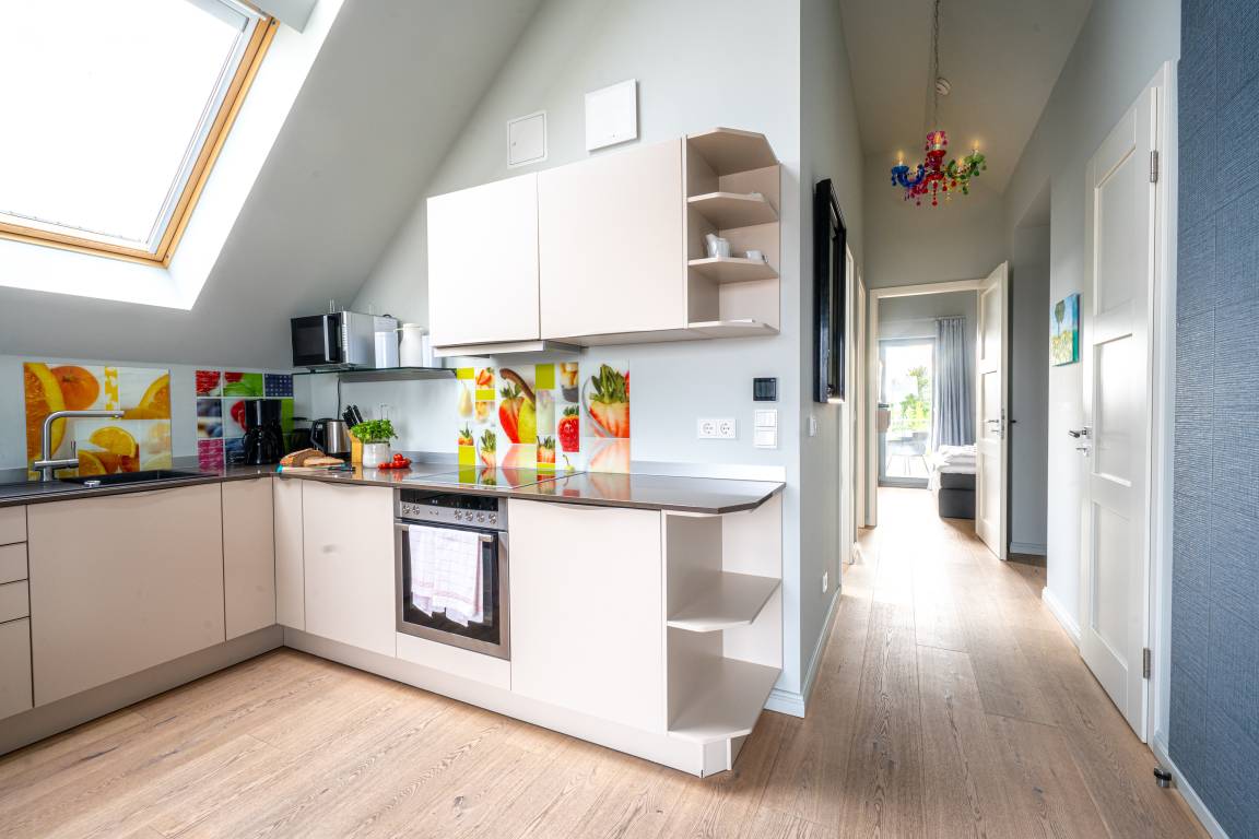 Die Wohnung ist mit Echtholz-Parkett ausgelegt. Der unverbaubare Ausblick (Süd/Ost) vom Wohnzimmerbalkon auf den Yachthafen und am Abend (Süd/West) vom Schlafzimmerbalkon auf den Binnensee mit der beleuchteten Promenade lassen Sie jeden Ferientag genießen. Die Wohnung hat zwei Schlafzimmer mit Einbauschränken (2x Boxspringbetten). Das geräumige Duschbad mit Regendusche und Fenster runden das Ambiente ab. Für Ihr Fahrzeug ist ein Stellplatz vor dem Haus reserviert.