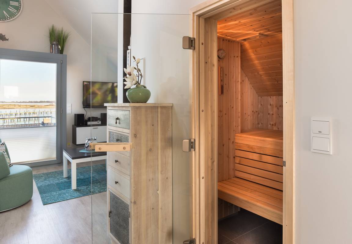 Unmittelbar gegenüber dem Bad befindet sich die gemütliche Sauna mit heller Fichtenholzausstattung.