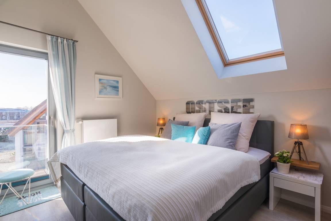 Die 2 Schlafzimmer sind mit komfortablen Boxspringbetten (1,80 x 2,00 m und 1,40 x 2,00 m) ausgestattet. Im größeren Schlafraum ist zusätzlich ein großer Flachbildfernseher vorhanden. Beide Schlafzimmer, die sich auf der vom Yachthafen abgewandten Seite befinden, sorgen durch Verdunklungs-Plissee-Anlagen und einem elektronischen Dachfensterrollo für einen erholsamen Schlaf. Ein Kinderreisebett ist ebenfalls vorhanden.
