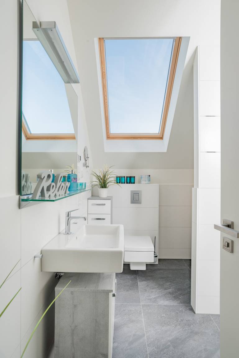 Das Duschbad ist mit einer Fußbodenheizung, einem Handtuchwärmer, begehbarer Dusche mit Regenbrause und einem kombiniertem Wasch-Trockner versehen.