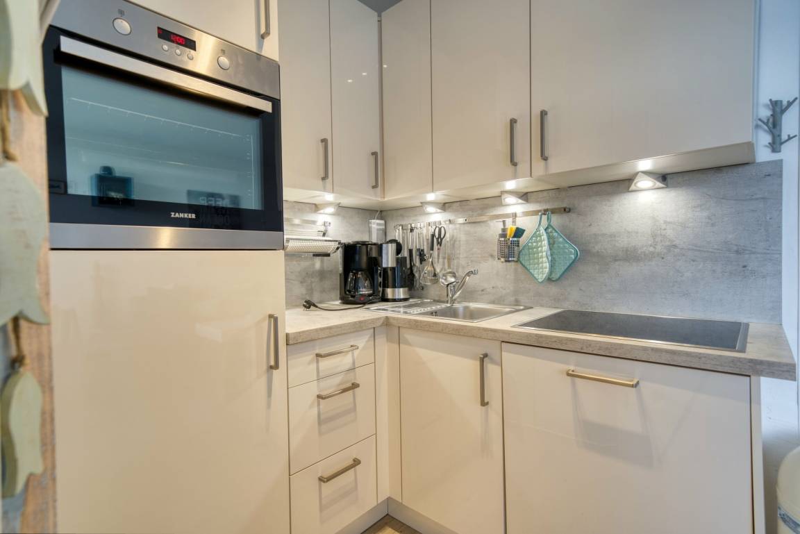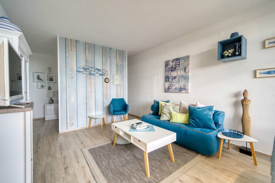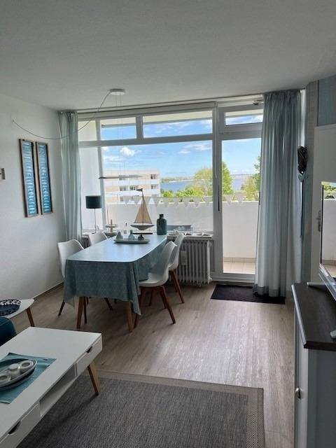 Helle Ferienwohnung 0M0501, Haus M, 5. Etage, ca. 45 m², für bis zu 4 Personen. Wohnbereich mit Smart-TV, Sofa und Verdunklung, Schlafbereich mit Doppelbett, separates Schlafzimmer mit Etagenbett. Essbereich im Wohnraum. Balkon mit Binnensee- und Yachthafenblick, Vinylboden. Küche mit Induktionskochfeld, Backofen, Geschirrspüler, Kühlschrank mit Gefrierfach, Kaffeemaschine, Geschirr für 4. Bad mit Dusche, WC, Handtuchtrockner. Bonus: Highspeed-WLAN, Saisonstrandkorb (Mai–Sept.). Nichtraucher, keine Haustiere, Fahrstuhl, abschließbare Fahrradräume, Strand ca. 300 m, Parkplatz kostenlos. Nähe Aktiv-Hus, Restaurants, Geschäfte, Schwimmbad, Sauna, Kinderspielwelt.