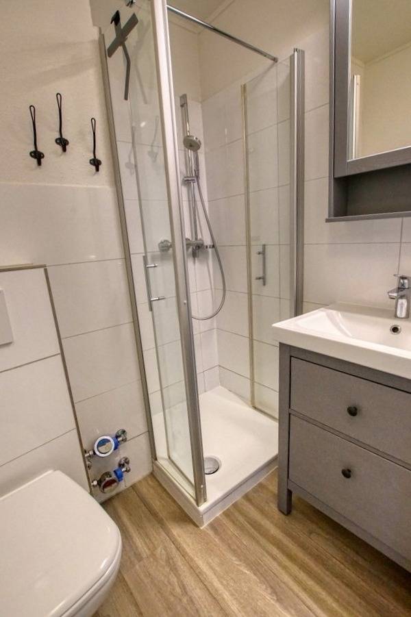 Modernes Bad mit Dusche, WC und Handtuchheizkörper. WLAN inklusive. Nichtraucherwohnung, keine Haustiere. Bonusleistungen: Eintrittskarten für Kinderspielwelt, Sauna und Schwimmbad. Strand, Promenade und Aktiv-Hus in wenigen Minuten erreichbar – ideal für Familienurlaub an der Ostsee.