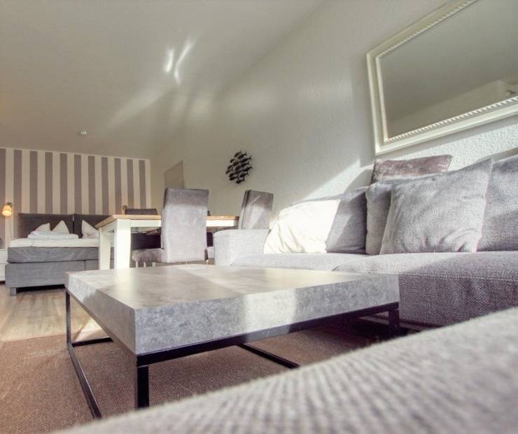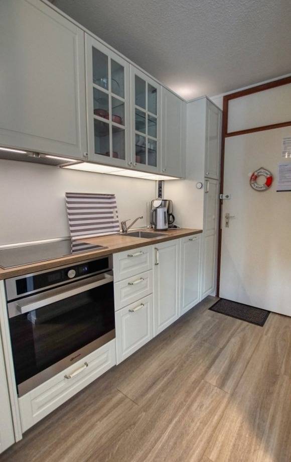 Die Ferienwohnung verfügt über ein Wohn-/Esszimmer mit Couch, Essecke, Flachbild-TV und einen Elternschlafbereich mit Doppelbett, TV und Zugang zum Kinderzimmer, ein Kinderzimmer mit ausziehbarem Einzelbett und TV sowie eine moderne Küche mit Backofen, Cerankochfeld, Kühlschrank mit Gefrierfach, Geschirrspüler, Kaffeemaschine und Wasserkocher.