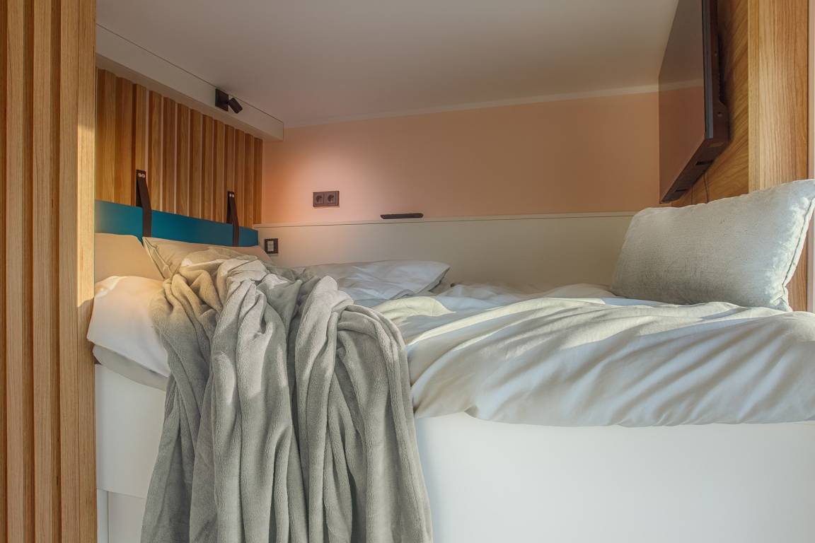 Die Koje 29 verfügt über maximal 2 Schlafmöglichkeiten durch ein konzipiertes Hochbett (160x200) im Alkovenstil mit Ausziehelementen als Stauraum und Bettzugang. Rollläden sorgen für Verdunklung. Steuerelemente gehören hier einfach auch dazu.
