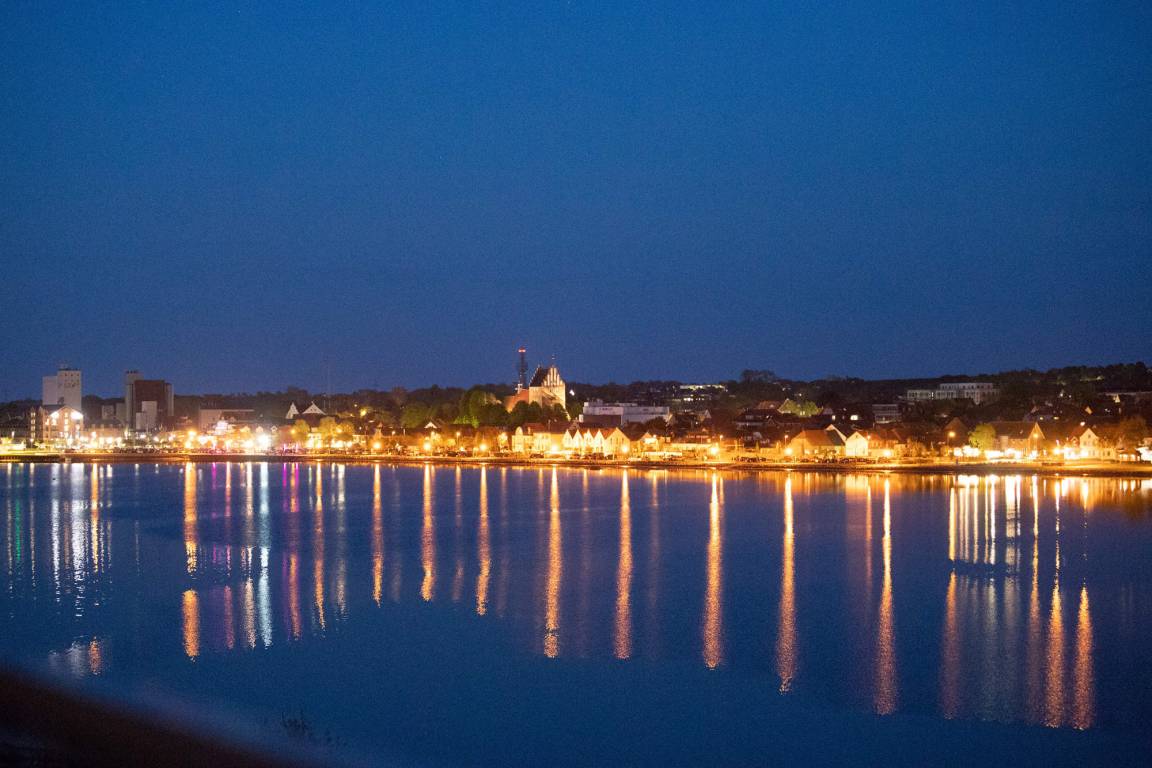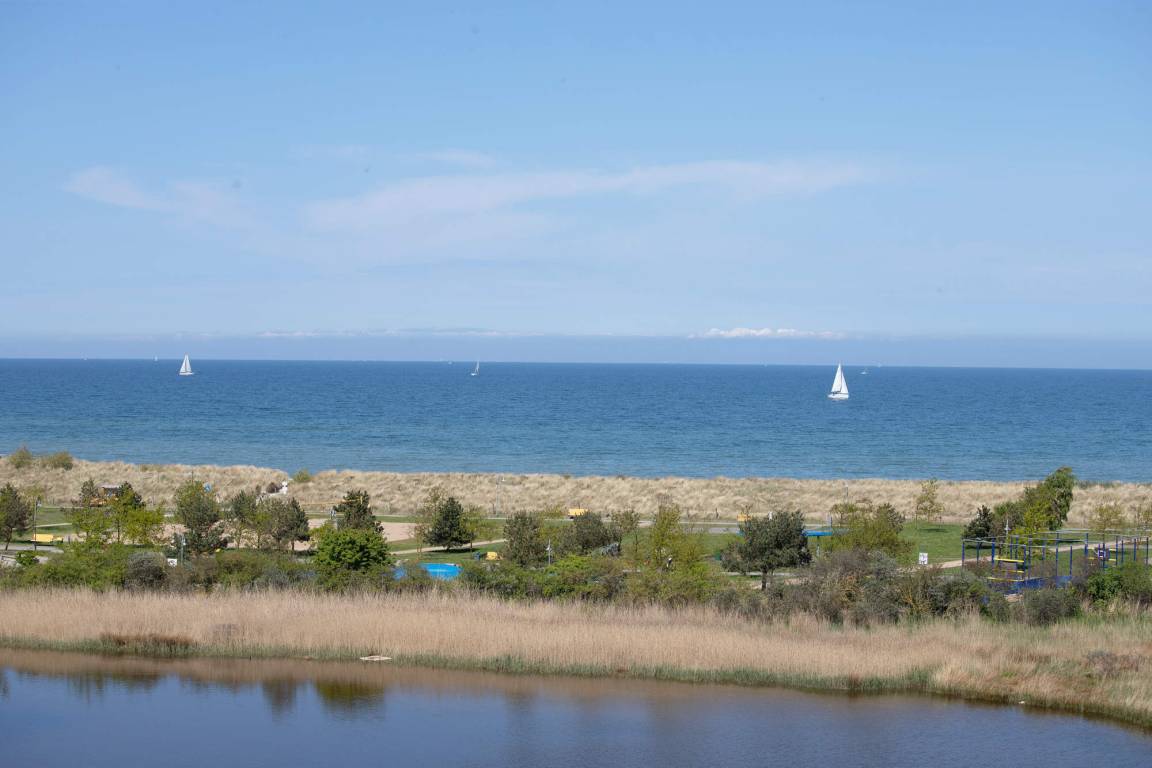 Der möblierte Balkon erlaubt einen unvergesslichen Blick auf Ostsee und den Binnensee.