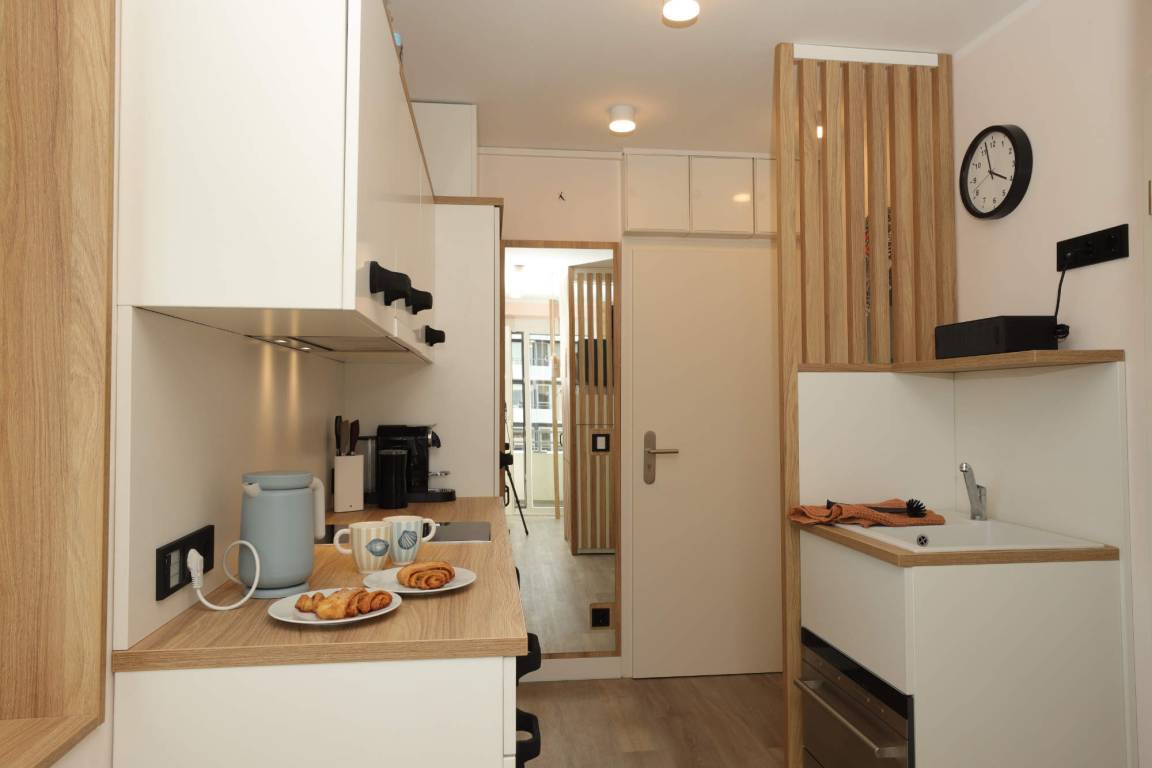 Der Küchenbereich ist quasi das Zentrum des Studios. Dieses ist zudem sehr komfortabel und bietet während des Kochens einen traumhaften Ostseeblick. Es ist alles an Geräten und Utensilien vorhanden, was Sie für Ihren hochwertigen Urlaub erwarten. Der Kulinarik steht nichts im Wege.