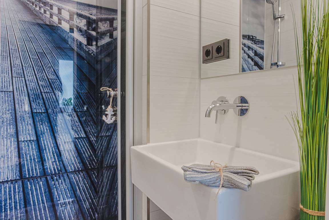 Das kleine Badezimmer mit ebenerdiger Dusche lädt auch an grauen und kalten Tagen zur Entspannung ein. Ein Trockner steht zudem im Erdgeschoss des Hauses zur Nutzung bereit.