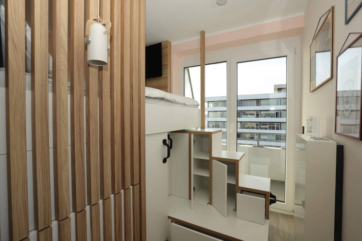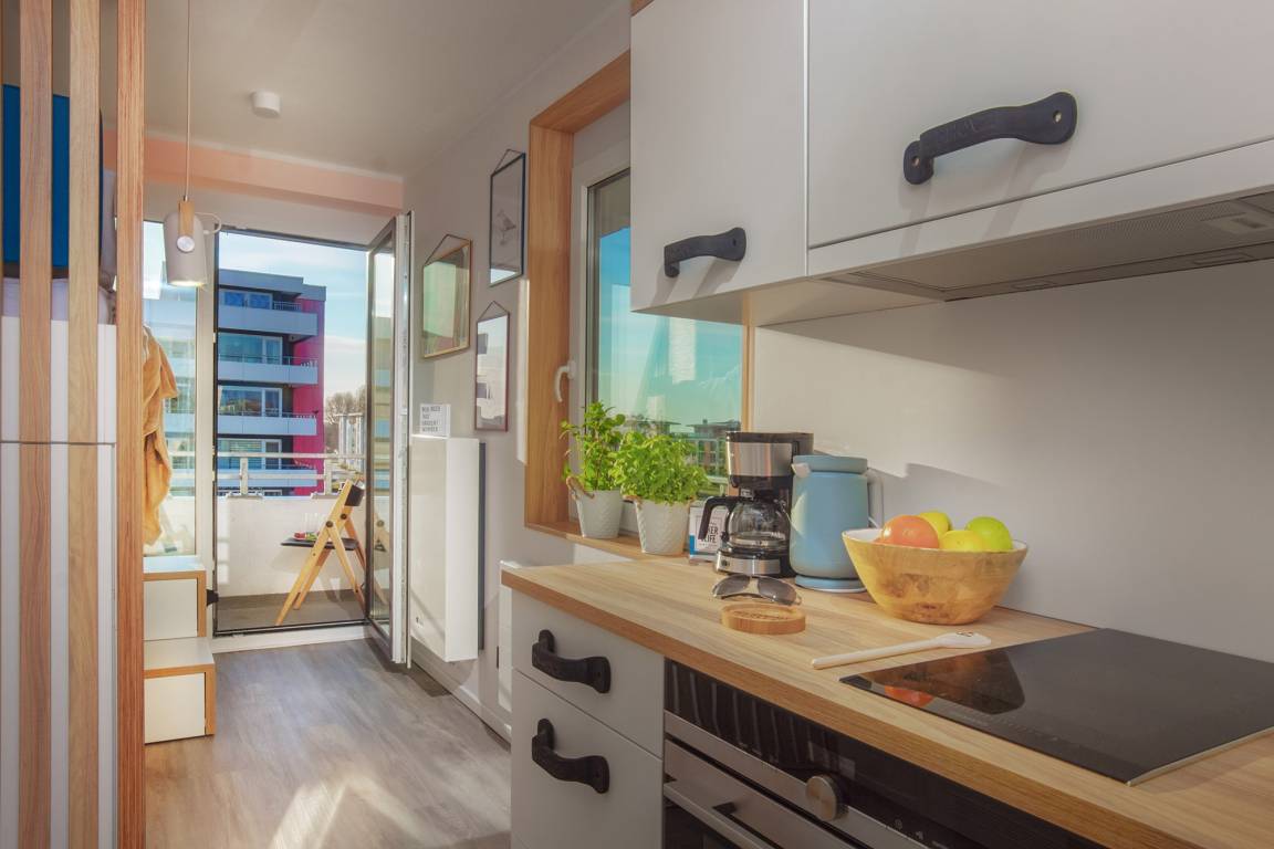 Klein, aber oho! Bei der Koje 29 steht der hochwertige Komfort für Gäste im Vordergrund, die weniger Raum brauchen. Auf ca. 16 qm Wohnfläche ist für den Aufenthalt der bestmögliche Raum für maximal 2 Erwachsene ausgeschöpft worden. Liebevoll designt und hochwertig mit maßgefertigten Einbaumöbeln eingerichtet, um die räumlichen Gegebenheiten optimal auszunutzen. Der Wohn- und Essbereich ist wandelbar gehalten und bietet diverse Annehmlichkeiten. Die technische Ausstattung mit TV, WLAN und Streamingmöglichkeit, Radio, sowie eine Haussteuerung sind extraklasse. Langweilig wird hier sicher niemanden.