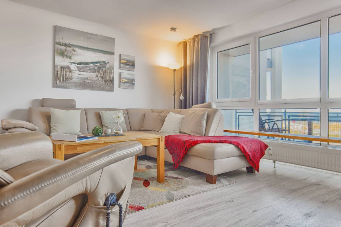 Der offene und großzügige (ca. 37 m²) Wohn- und Essbereich besticht durch eine lichtdurchflutete Panorama-Fensterfront, die einen herrlichen Blick auf die Ostsee und die angrenzenden Dünen bietet. Eine große Ledereckcouch mit Schlaffunktion lädt zum Entspannen ein, während der moderne 55-Zoll-LCD-TV mit Grundig-Soundsystem für beste Unterhaltung sorgt. Ein Esstisch für vier Personen rundet den Wohnbereich ab und bietet den perfekten Platz für gemeinsame Mahlzeiten oder einen gemütlichen Spieleabend – Gesellschaftsspiele und Bestseller-Bücher stehen zur Verfügung.