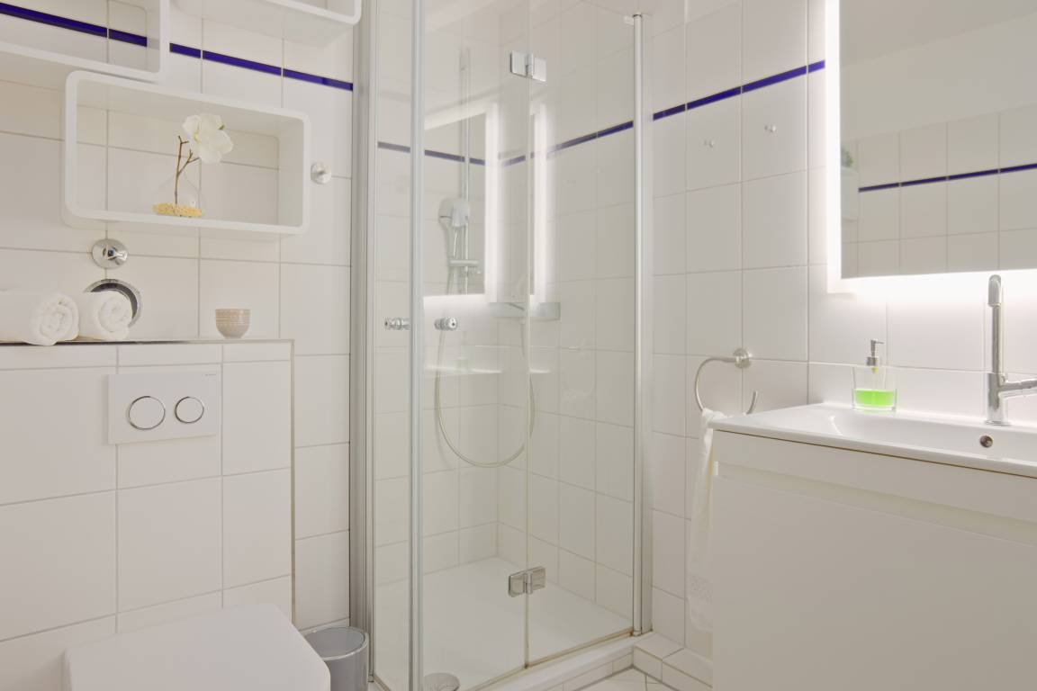 Das hochwertige, moderne Badezimmer ist mit einer geräumigen Dusche, einem beleuchteten Spiegel, einem Handtuchwärmer und einem Föhn ausgestattet – perfekt für einen angenehmen Start in den Tag.