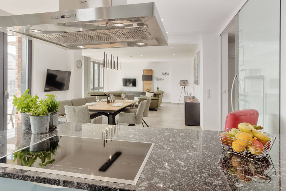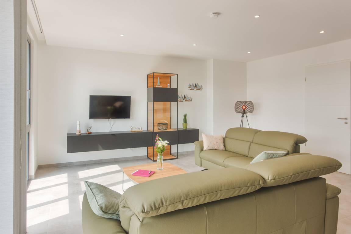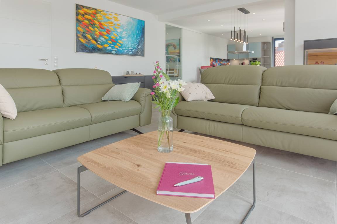 Im geschmackvoll eingerichteten Wohnbereich erwarten Sie zwei bequeme Couches (eine davon mit Schlaffunktion), ein Relax Sessel, Smart-TV, WLAN sowie Streaming-Möglichkeiten. Eine Auswahl an Büchern und Spielen rundet das Unterhaltungsangebot ab – Langeweile kommt hier garantiert nicht auf.