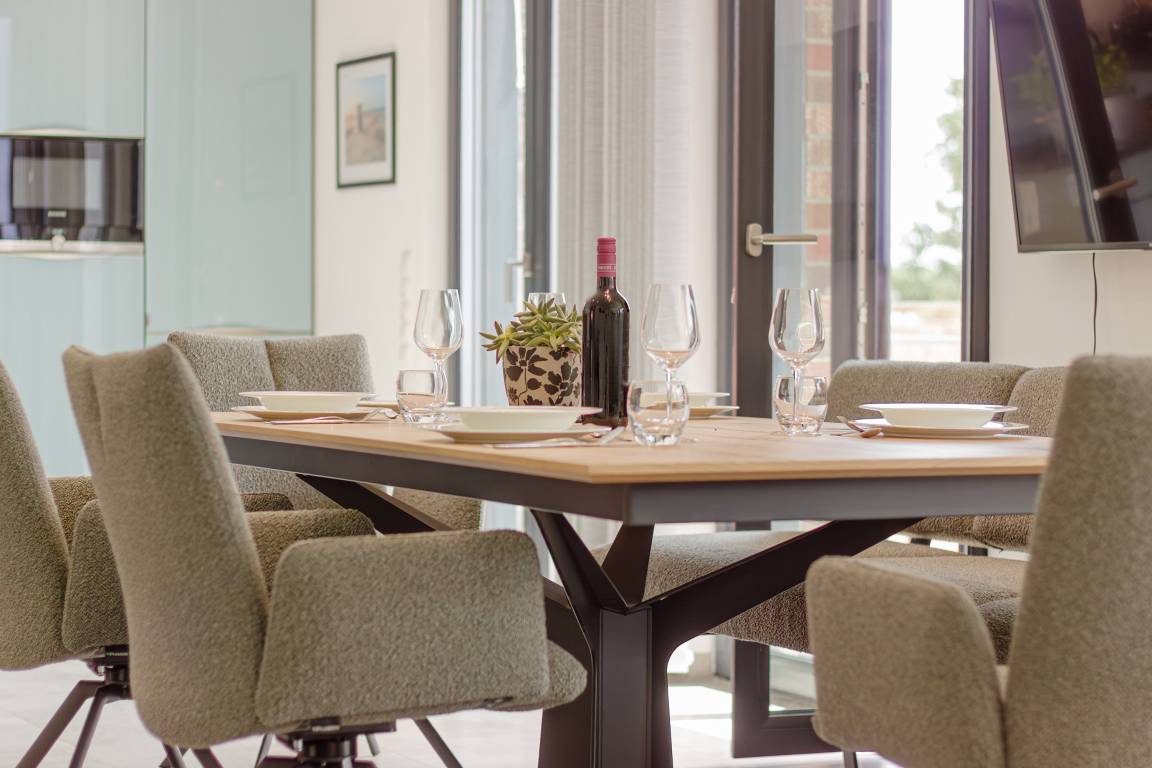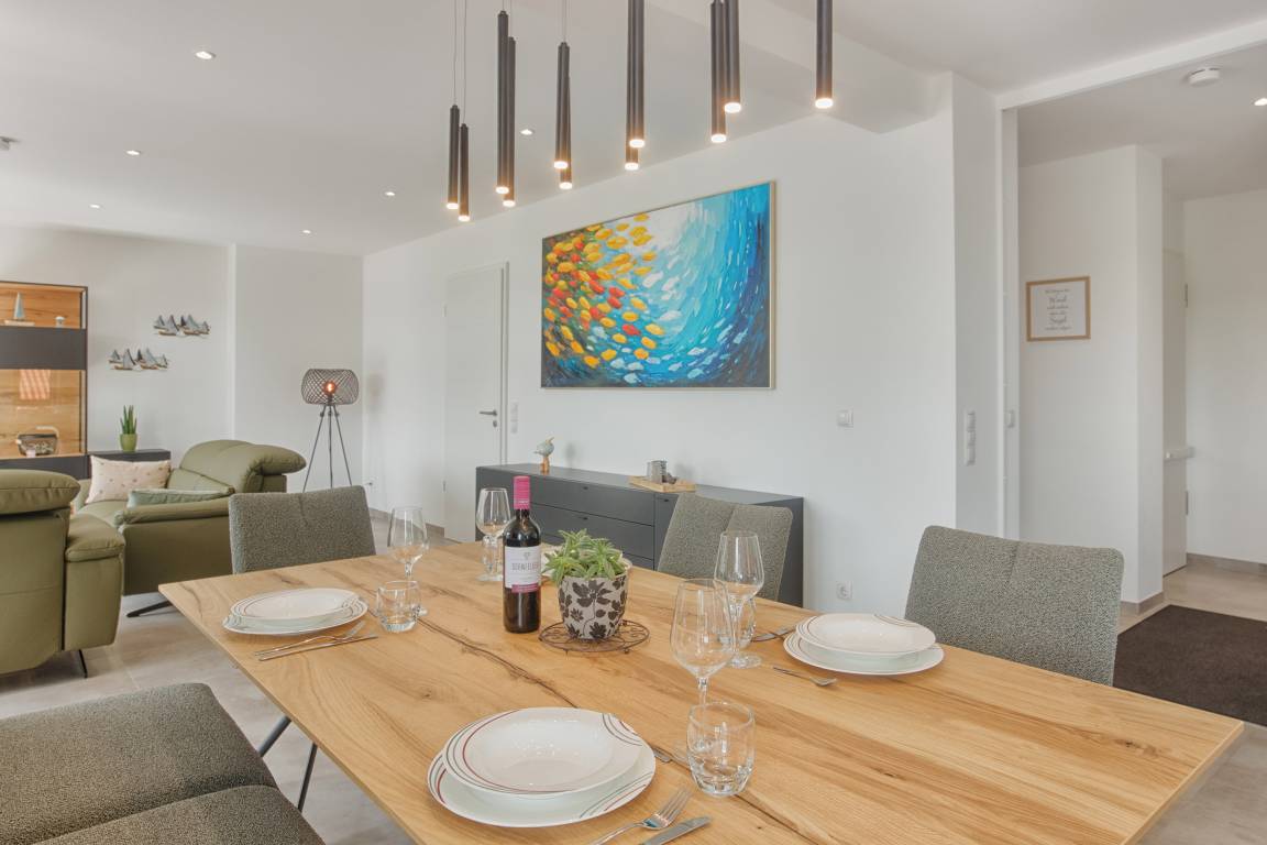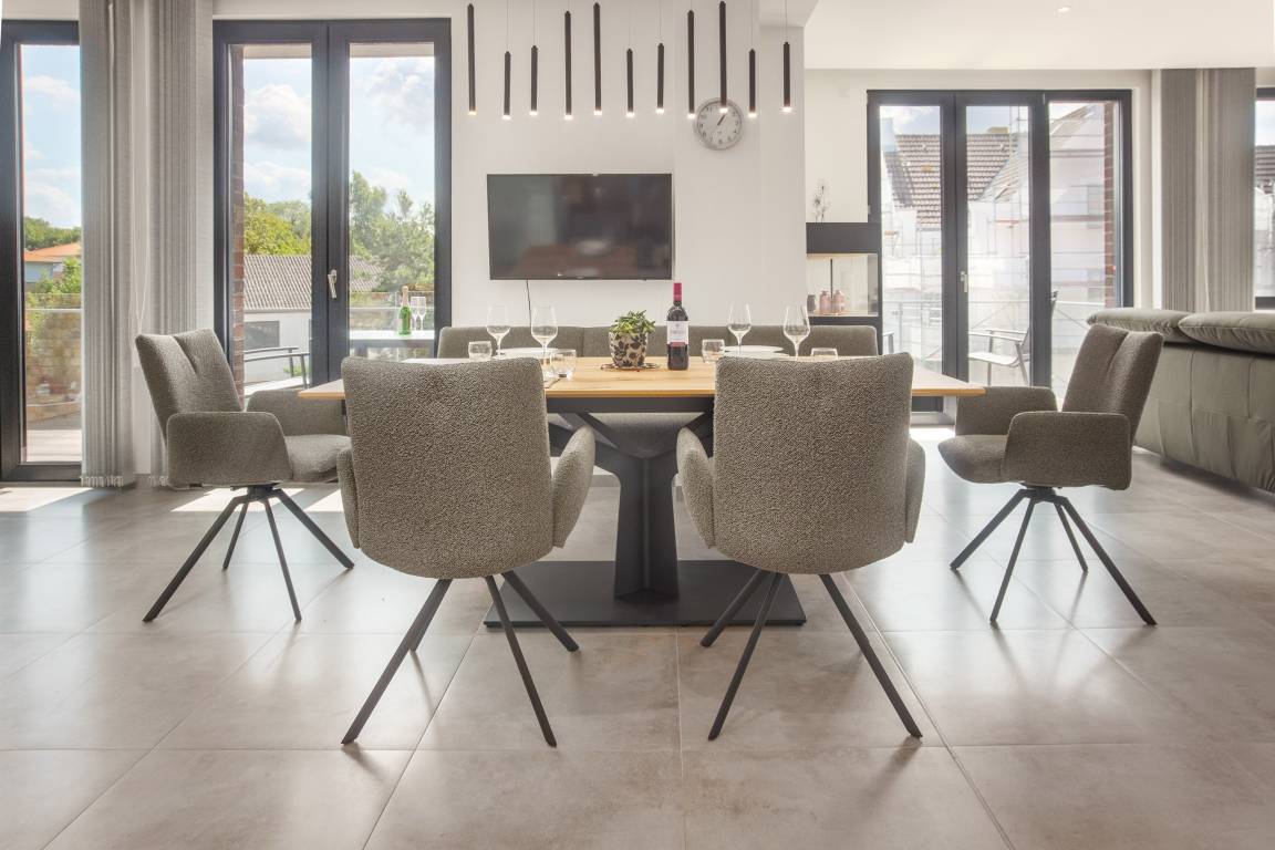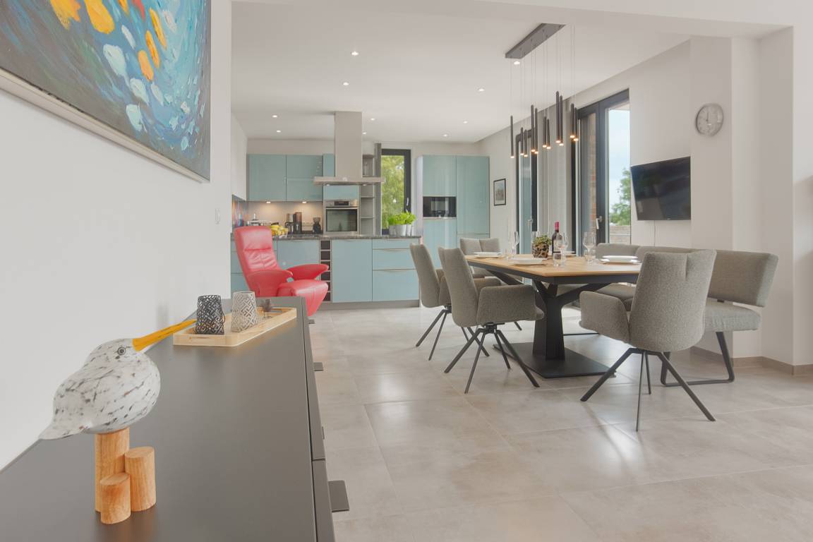Die offene, voll ausgestattete Küche mit Kochinsel lässt keine Wünsche offen. Kleinere Hilfen sind vorhanden. Ob Snack oder großes Menü – alles ist möglich. Der angrenzende Essbereich mit ausziehbarem und unterfahrbarem Tisch bietet viel Platz für gesellige Mahlzeiten mit Familie, Freunden oder Urlaubsbekanntschaften.