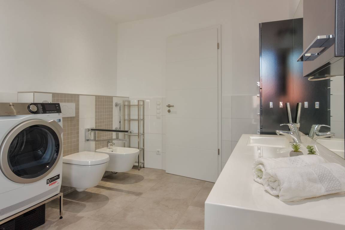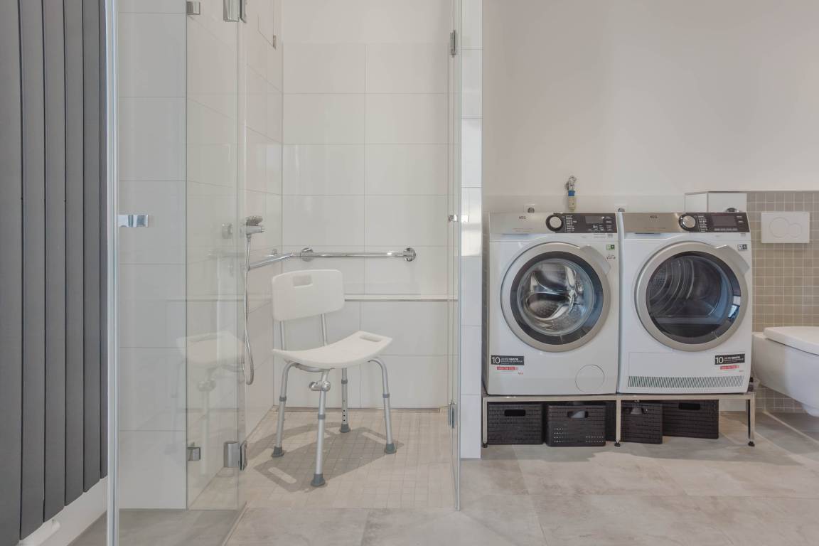 Das komfortable Badezimmer mit Tageslicht verfügt über eine barrierefreie, ebenerdige Dusche, WC und Bidet, beleuchtete Spiegel und Handtuchwärmer. Haltegriffe in der Dusche und beim WC, Duschhocker und ein unterfahrbarer Waschtisch sind praktische Helfer. Eine Waschmaschine und ein Trockner sind hier zudem zur bequemen Nutzung clever integriert. Zusätzlich gibt es in der Unterkunft ein separates Gäste-WC.