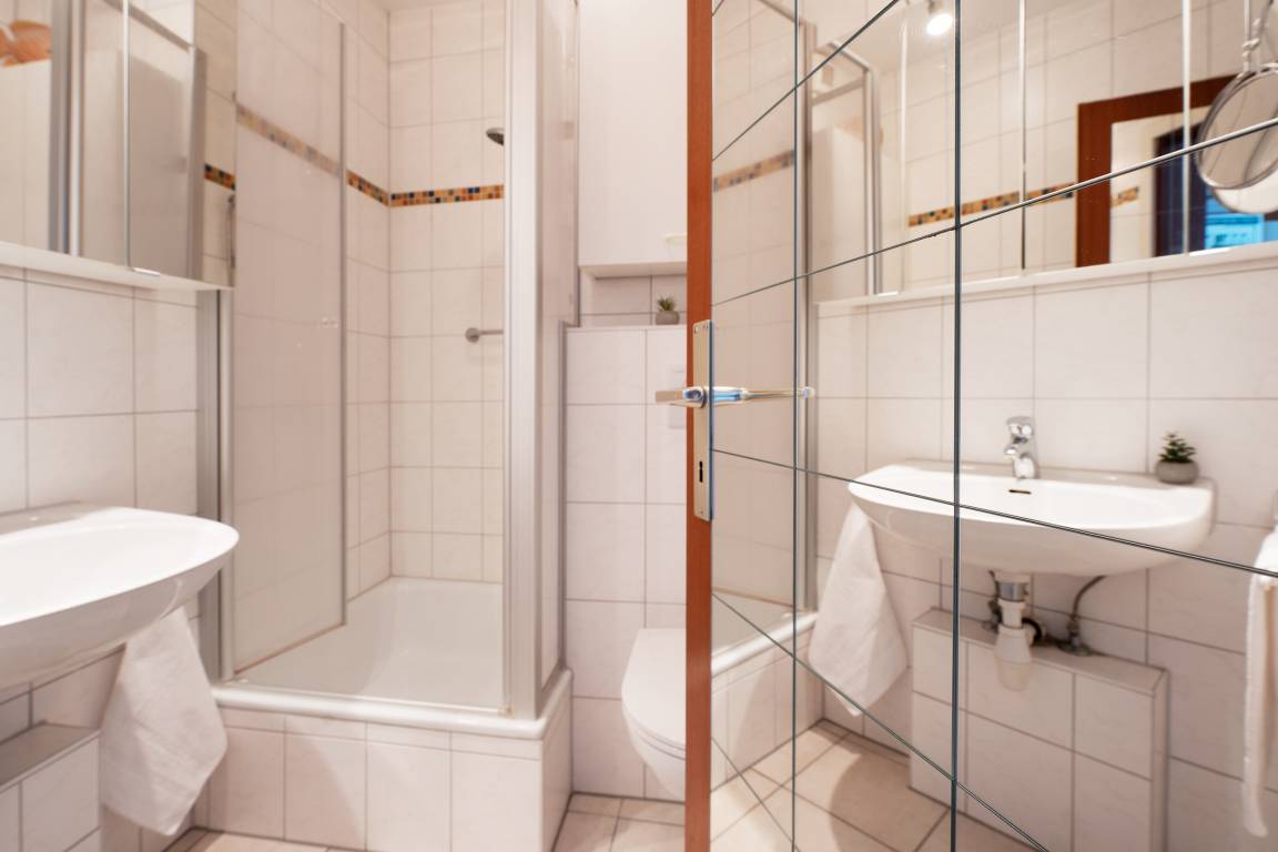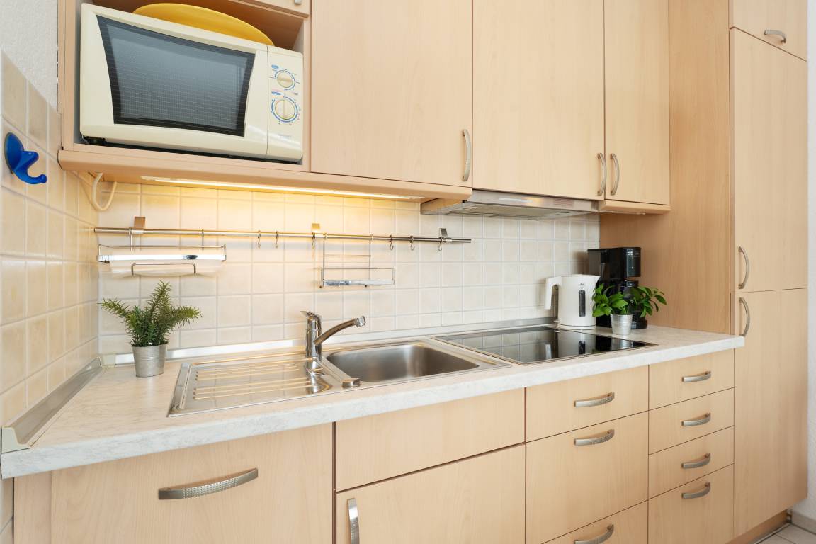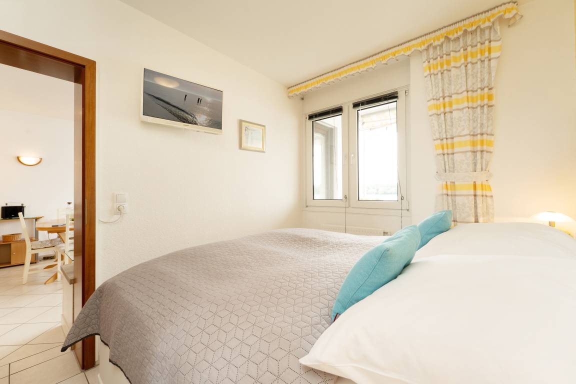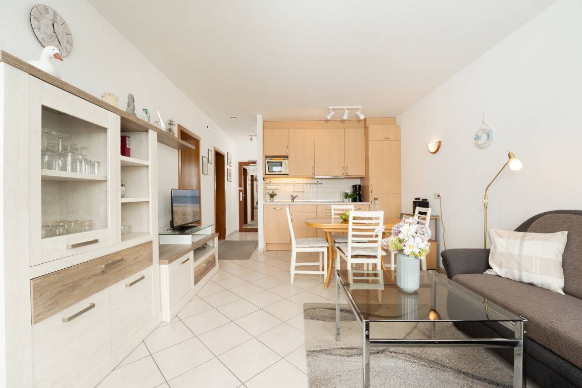Freuen Sie sich auf einen hellen Wohnbereich mit bequemer Sofaecke, Fernseher und Radio – perfekt für entspannte Stunden. Direkt vom Wohnraum betreten Sie den sonnigen Südbalkon mit Outdoormöbeln ausgestattet, der zum Essen im Freien einlädt. Die voll ausgestattete Küchenzeile verfügt über ein 4-Platten-Cerankochfeld, Backofen, Mikrowelle, Kühlschrank mit Gefrierfach, Geschirrspüler, Kaffeemaschine, Wasserkocher und Toaster. Im angrenzenden Essbereich finden alle Gäste bequem Platz. Das Hauptschlafzimmer bietet ein Doppelbett und einen weiteren Fernseher, im zweiten Schlafzimmer sorgt ein Etagenbett für kindgerechte Schlafplätze. Das Bad verfügt über Dusche mit flachem Einstieg (33 cm) und WC.