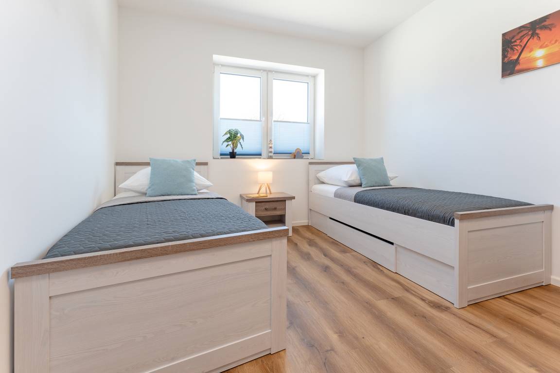 Schlafzimmer 2: 1 Doppelbett (2x 90x200 cm), Kleiderschrank, Verdunkelung: Verdunkelungsplissees und -vorhänge, Platz für ein Babybett vorhanden