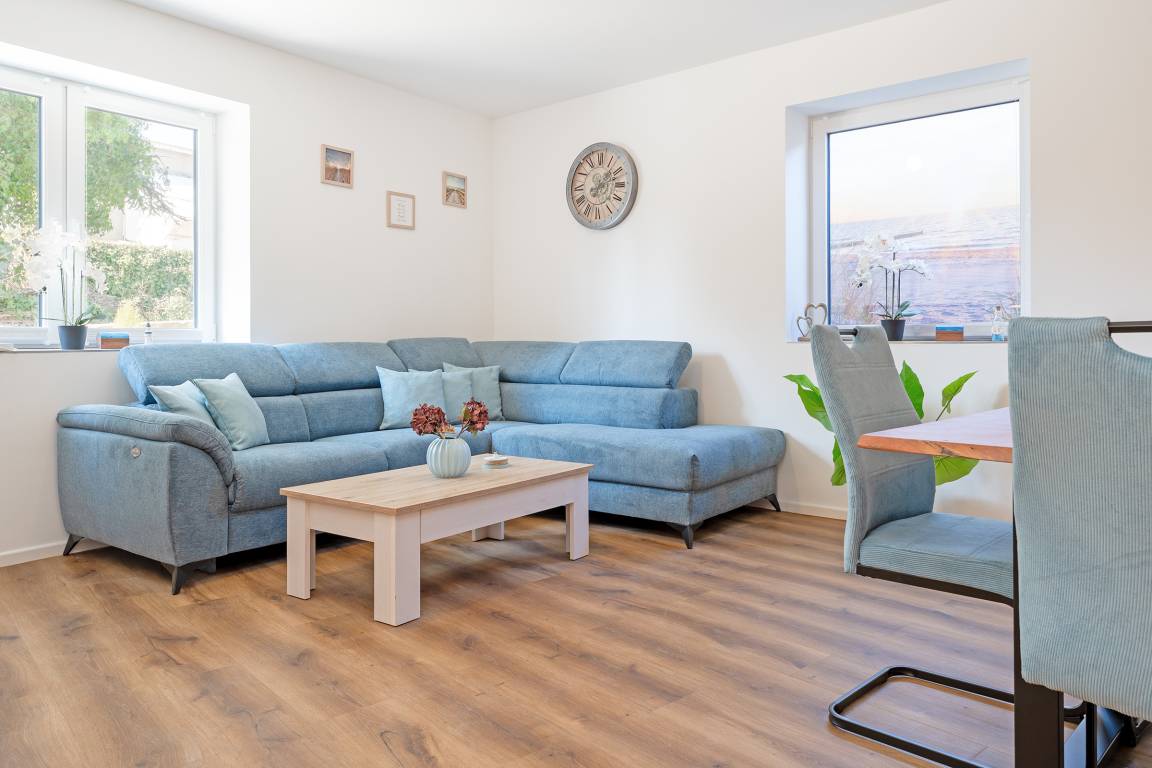 Diese großzügige und hochwertig ausgestattete Ferienwohnung in Heiligenhafen lädt mit modernem Komfort und stilvoller Einrichtung zu einem unvergesslichen Urlaub an der Ostseeküste ein. Der offene Wohnbereich ist lichtdurchflutet und bietet eine gemütliche Sofaecke, einen großen TV und einen Essbereich für gemeinsame Mahlzeiten.