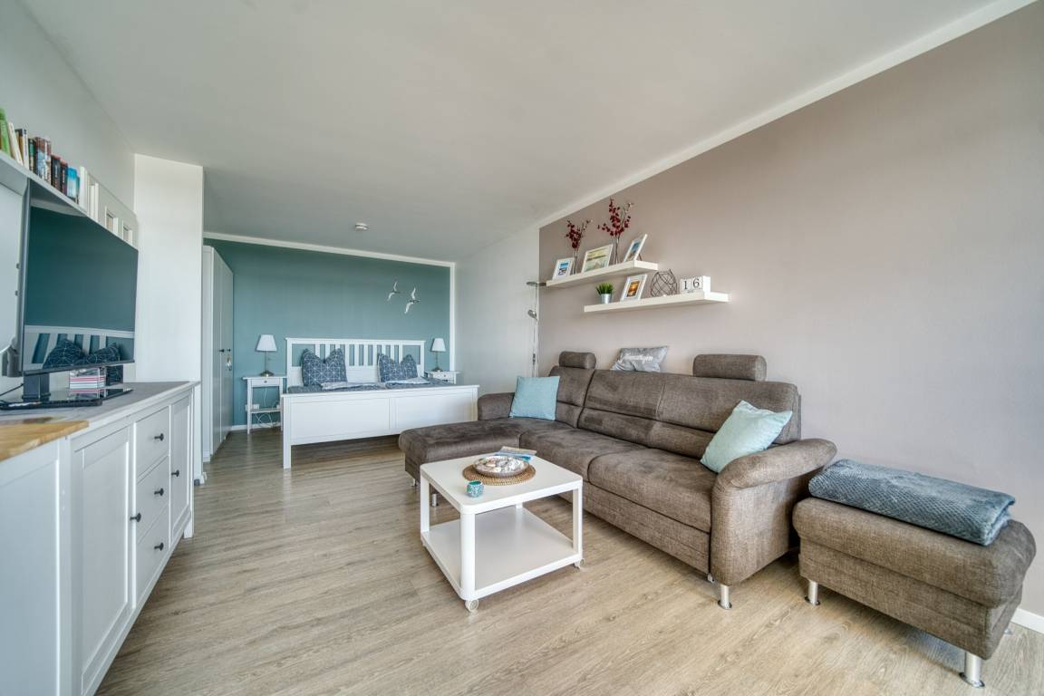 Diese liebevoll eingerichtete 1,5-Zimmer-Wohnung im Haus E, 7. Etage, mit Westbalkon bietet herrlichen Ostseeblick.
