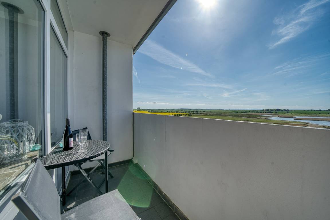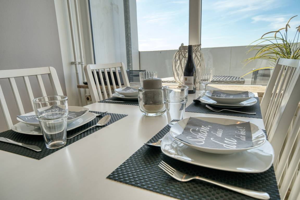 Wohnfläche 45 m²: offener Wohn-Schlafbereich mit Doppelbett, Kinderzimmer mit Etagenbett, Küchenzeile, Duschbad und Flur. Wohnbereich mit Ecksofa, Smart-TV und Essbereich mit Blick auf Leuchtturm und Salzwiesen. Küchenzeile mit Ceranfeld, Backofen, Spülmaschine, Mikrowelle, Kühlschrank mit Gefrierfach, Kaffeemaschine, Toaster, Wasserkocher. Kinderzimmer ebenfalls mit Smart-TV, dimmbare Lampen mit USB-Anschluss. Kostenloses WLAN und Eintritt in die Spielewelt des Aktiv-Hus inklusive. Nichtraucherwohnung, max. 4 Personen, keine Haustiere. Balkon mit traumhafter Aussicht und Sonnenuntergang.