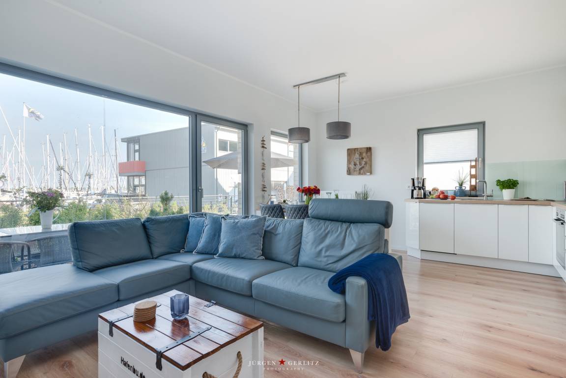 Aus dem gemütlich eingerichteten Wohnzimmer mit Kamin und der sehr gut ausgestatteten offenen Küche mit großem Esstisch haben Sie einen traumhaften Blick auf den Yachthafen. Das Wohnzimmer ist mit einem großen Flachbild TV, einer Musikanlage und einer Playstation Spielkonsole ausgestattet.