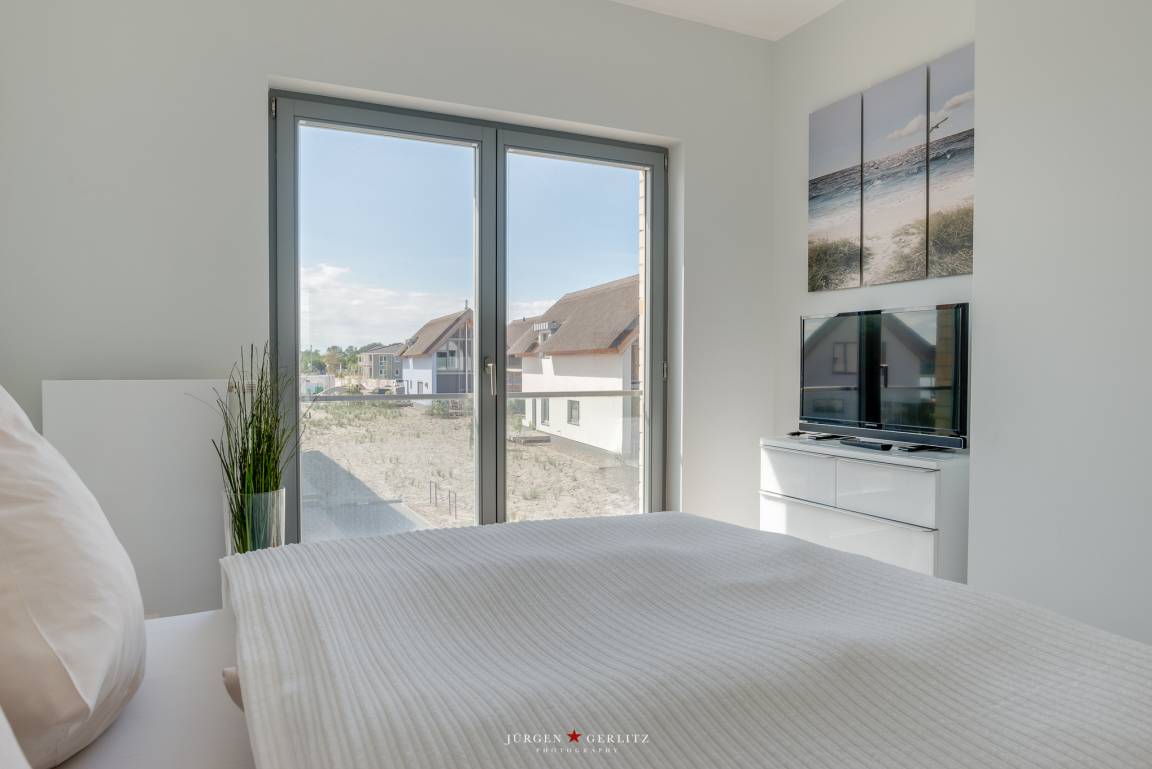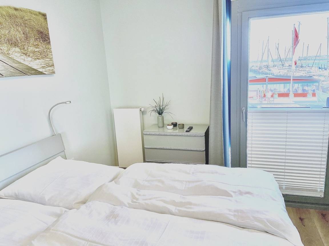 Aus einem der großen Schlafzimmer mit Doppelbett (160x200cm) und vom großen Balkon genießen Sie den Ausblick auf den Yachthafen, morgens umschmeichelt von einem traumhaften Sonnenaufgang über dem Wasser.