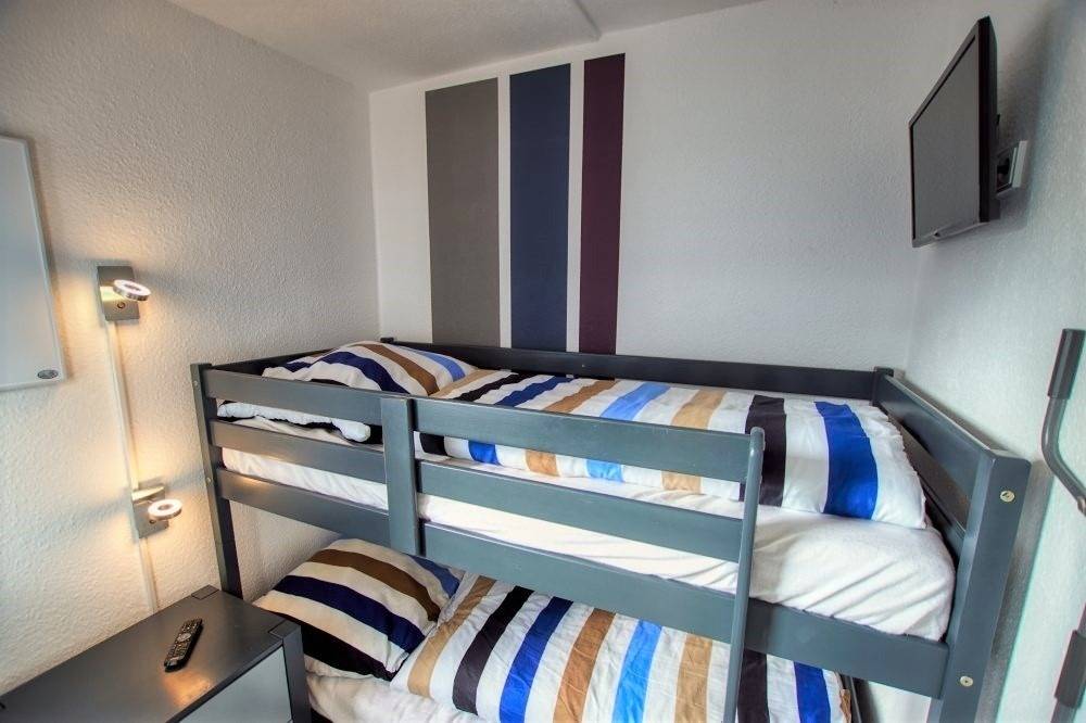 Zur Ausstattung gehören ein Wohn-Esszimmer mit Fernseher und Radio, ein Elternschlafbereich im Wohnzimmer mit Doppelbett sowie ein separates Kinderzimmer mit Etagenbett. Die neue Küche ist komplett ausgestattet mit Kühlschrank, Backofen, Ceranfeld, Geschirrspüler, Wasserkocher und Toaster. Das Bad verfügt über WC und Duschkabine mit niedrigem Einstieg. Kostenloses WLAN ist vorhanden. Nichtraucherwohnung, keine Haustiere, Fahrstuhl, Parkplatz hinter dem Ferienpark. Strand ca. 300 m entfernt, Aktiv-Hus mit Schwimmbad, Sauna, Wellness und Kinderspielwelt in der Nähe.