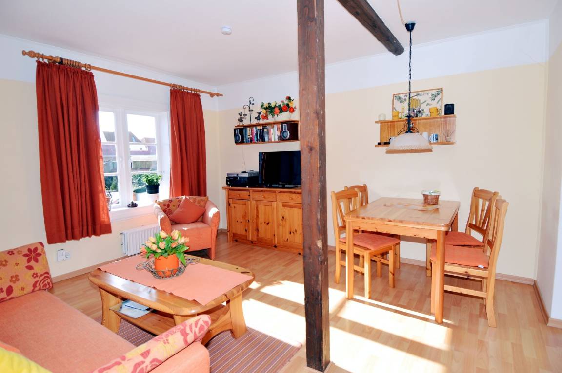 Herzstück der Wohnung ist der gemütliche Wohn- und Essbereich, der hell gestaltet ist und zum Verweilen einlädt. Eine bequeme Couch, ein Esstisch sowie ein Fernseher stehen für entspannte Stunden zur Verfügung. Für Unterhaltung und Komfort sorgen zudem WLAN / WiFi sowie ein Radio, sodass Sie auch im Urlaub bestens vernetzt bleiben oder den Tag bei Musik ausklingen lassen können.
