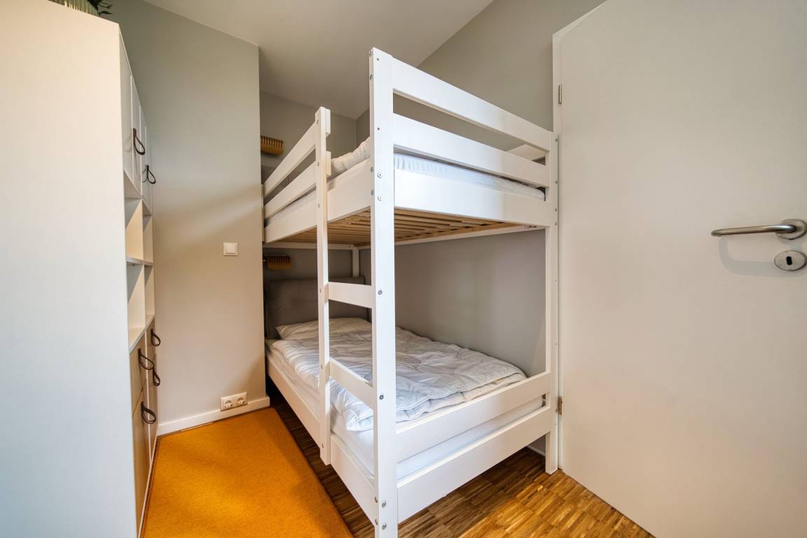 Wohnfläche ca. 45 m². Elternschlafbereich mit Doppelbett, Smart-TV und Einbauschrank. Kinderzimmer mit Doppelbett, Smart-TV und Schrank. Offener Wohnbereich mit Couch, Smart-TV, Radio/Bluetooth. Küche mit Spülmaschine, Backofen/Mikrowelle, Induktionsherd, Toaster, Kühlschrank/Gefrierfach, Kaffeemaschine. Modernes Bad mit Dusche. WLAN, Kinderspielweltkarte inklusive. Nichtraucher, max. 4 Personen, Fahrstuhl, kostenfreier PKW-Stellplatz. Strand ca. 300 m, Promenade fußläufig. Ferienpark mit Shops, Aktiv-Hus, Schwimmbad, Sauna, Wellness, Kinderspielwelt.
