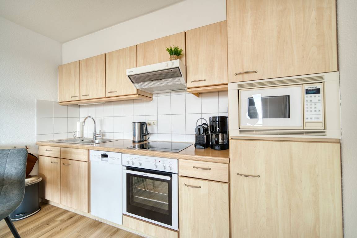 Küche: Ceranherd, Backofen, Geschirrspüler, Mikrowelle, Kühlschrank, Kaffeemaschine, Toaster, Wasserkocher