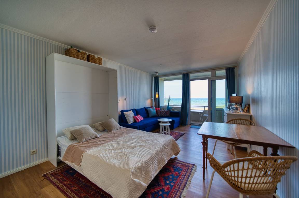 Der Wohn-Schlafraum ist mit einem praktischen Schrankbett ausgestattet. Die kleine Küche verfügt über Kühlschrank mit Gefrierfach, Toaster, Wasserkocher und 2-Kochfeld-Herd. Das Bad ist mit Fußbodenheizung ausgestattet.