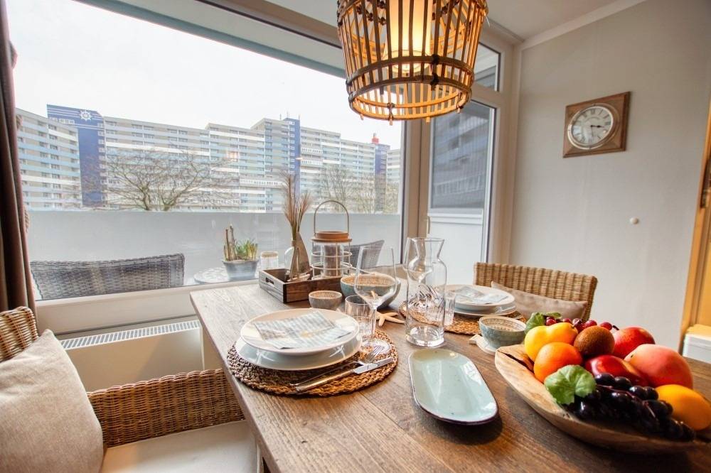 Diese modern eingerichtete Ferienwohnung im Haus Q des Ferienparks Heiligenhafen bietet auf 45 m² komfortablen Platz für 2 Personen im maritimen Beachstyle. Der ruhige Balkon mit Blick auf den grünen Innenhof lädt zum Entspannen ein.