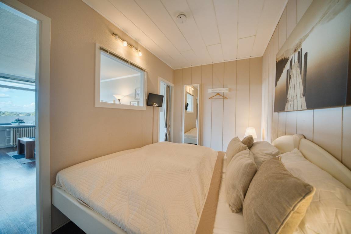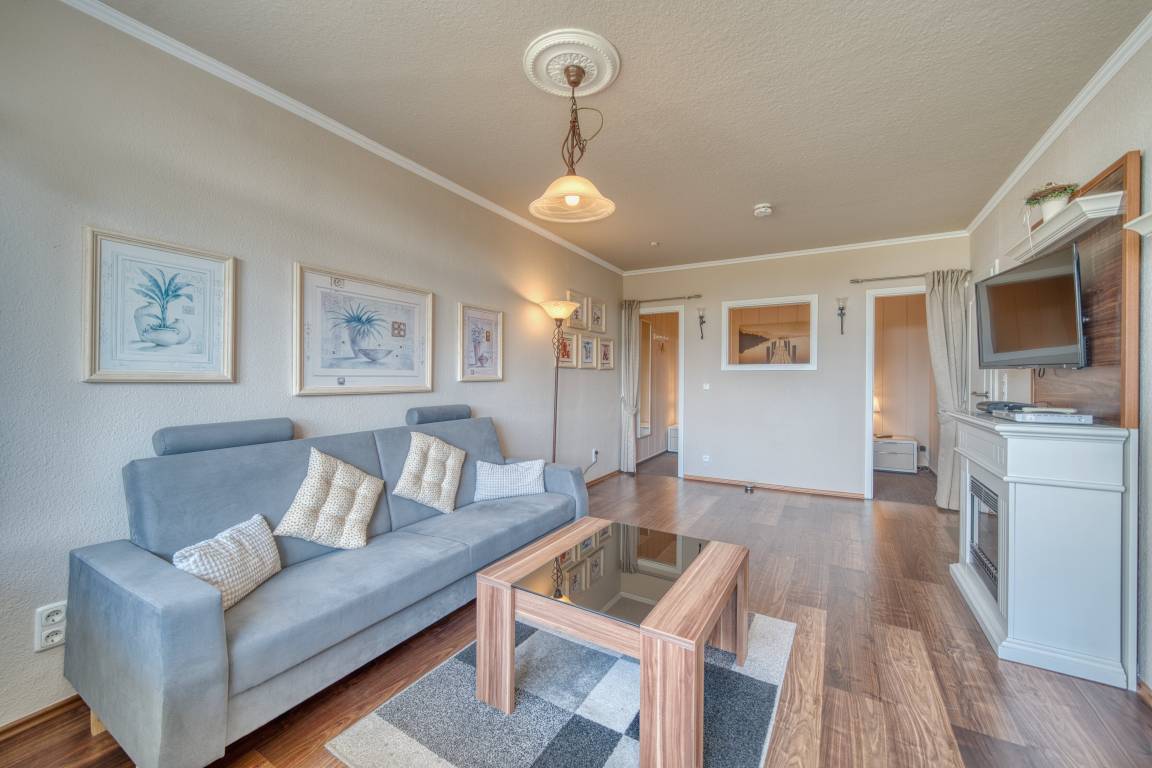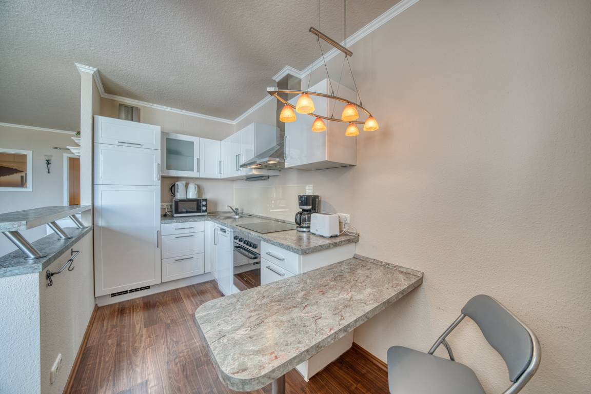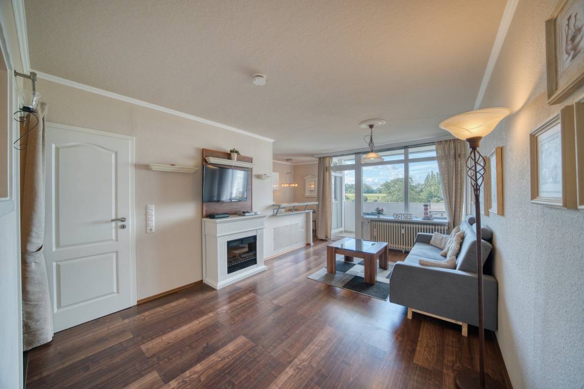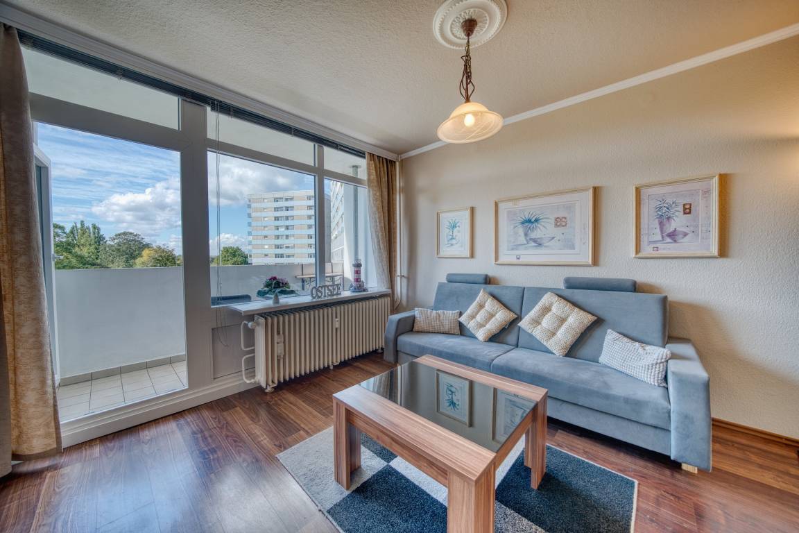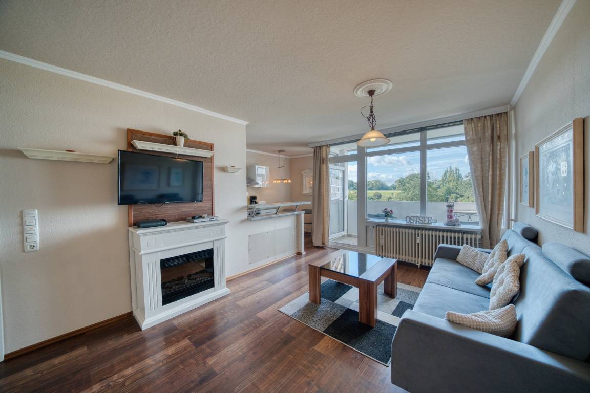 Wohn-Esszimmer mit Fernseher und Schlafcouch für eine Person. Separates Schlafzimmer mit Doppelbett und TV. Offene Küche mit Tresen, Herd, Kühlschrank, Geschirrspüler. Bad mit WC und Dusche. Balkon mit Salzwiesenblick. Nichtraucherwohnung, Haustiere nicht erlaubt, WLAN inklusive. Belegung bis 3 Personen. Ca. 300 m bis zum Strand, Nähe Aktiv-Hus mit Schwimmbad, Sauna, Wellness und Kinderspielwelt.
