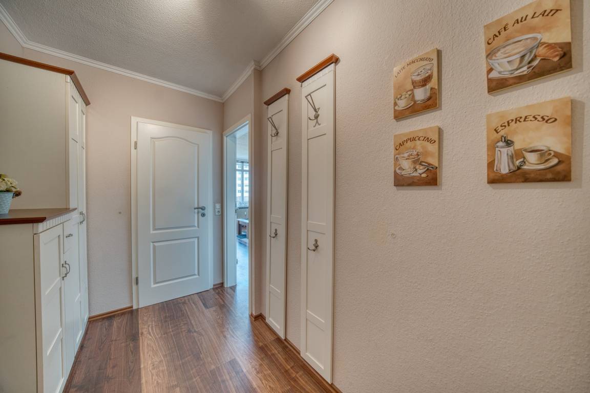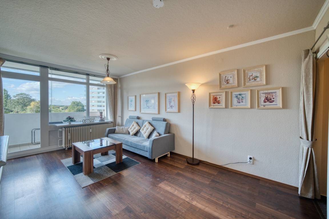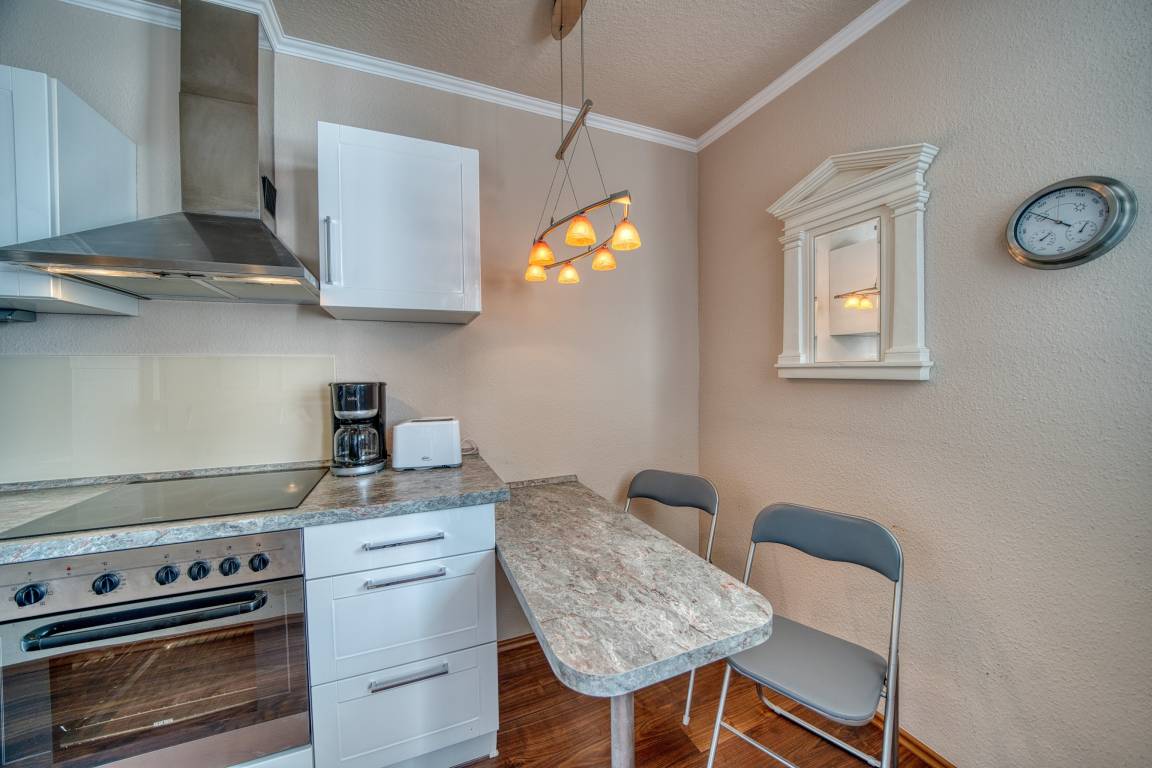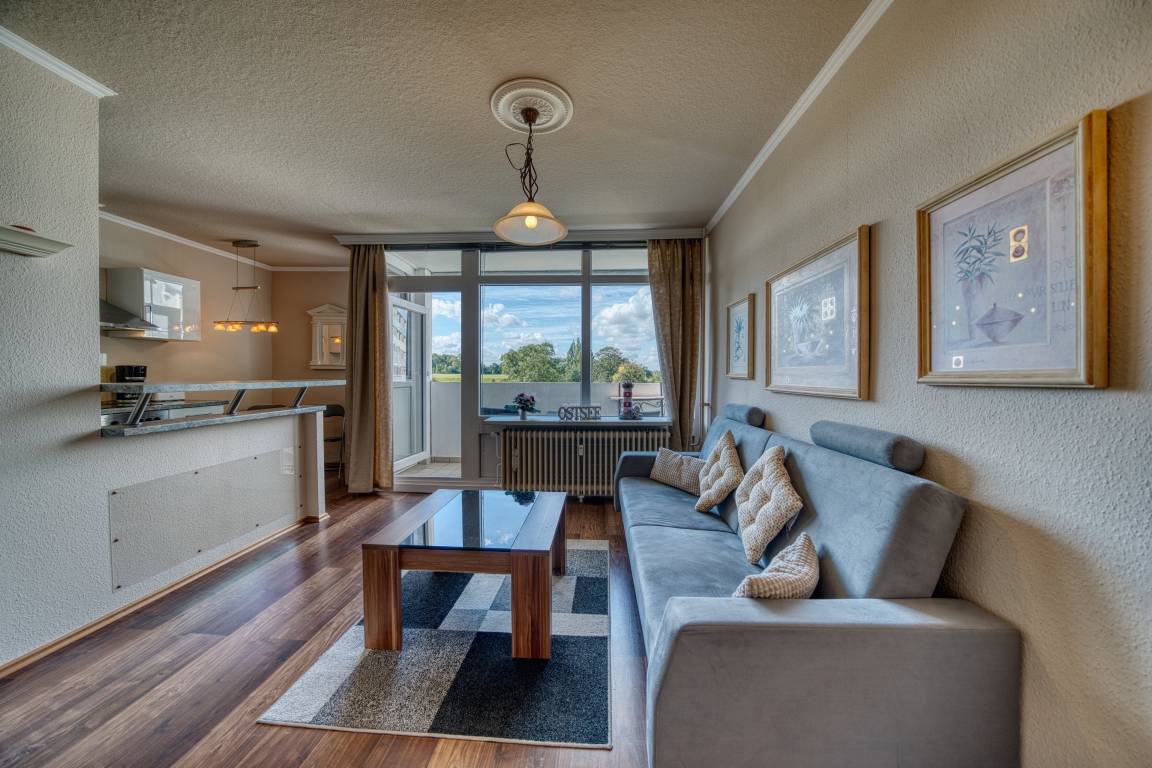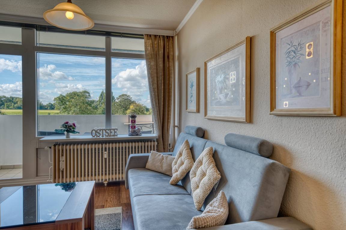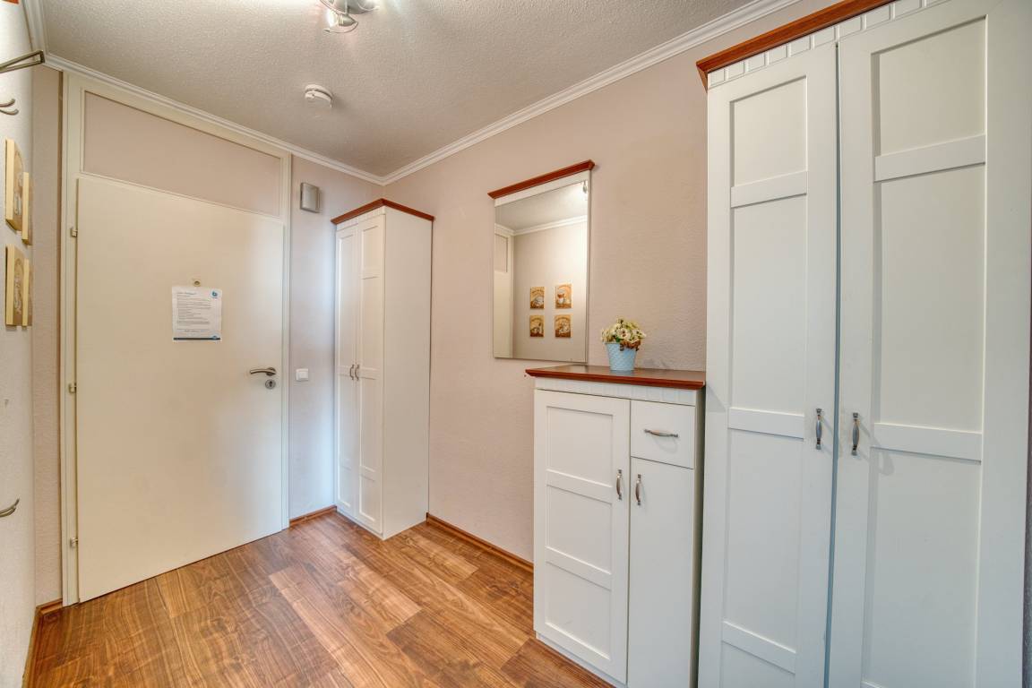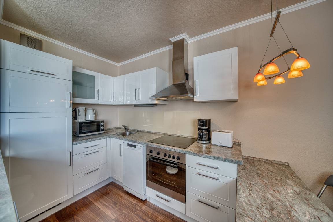 Wohn-Esszimmer mit Fernseher und Schlafcouch für eine Person. Separates Schlafzimmer mit Doppelbett und TV. Offene Küche mit Tresen, Herd, Kühlschrank, Geschirrspüler. Bad mit WC und Dusche. Balkon mit Salzwiesenblick. Nichtraucherwohnung, Haustiere nicht erlaubt, WLAN inklusive. Belegung bis 3 Personen. Ca. 300 m bis zum Strand, Nähe Aktiv-Hus mit Schwimmbad, Sauna, Wellness und Kinderspielwelt.