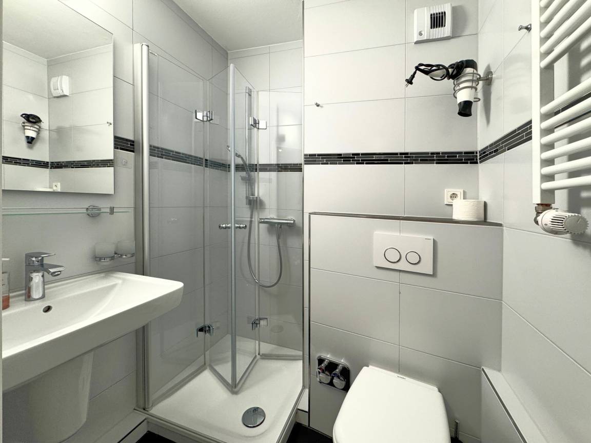 Das Badezimmer ist praktisch eingerichtet und verfügt über eine Dusche, ein WC, ein Waschbecken, einen Handtuchwärmer sowie einen Föhn – ideal, um sich nach einem Strandtag oder nach Aktivitäten im Ferienpark schnell zu erfrischen.
