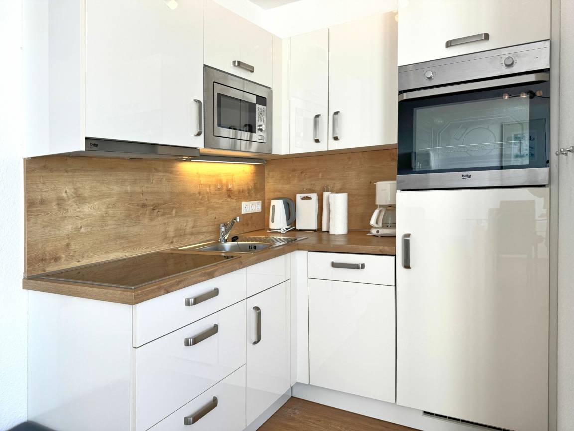 Die Küche ist vollständig ausgestattet und bietet alles, was Sie für die Selbstversorgung im Urlaub benötigen. Neben einem Cerankochfeld und einem Backofen stehen Ihnen eine Spülmaschine, ein Kühlschrank mit Gefrierfach, eine Mikrowelle sowie Kaffeemaschine, Toaster und Wasserkocher zur Verfügung.