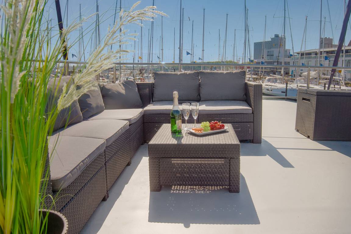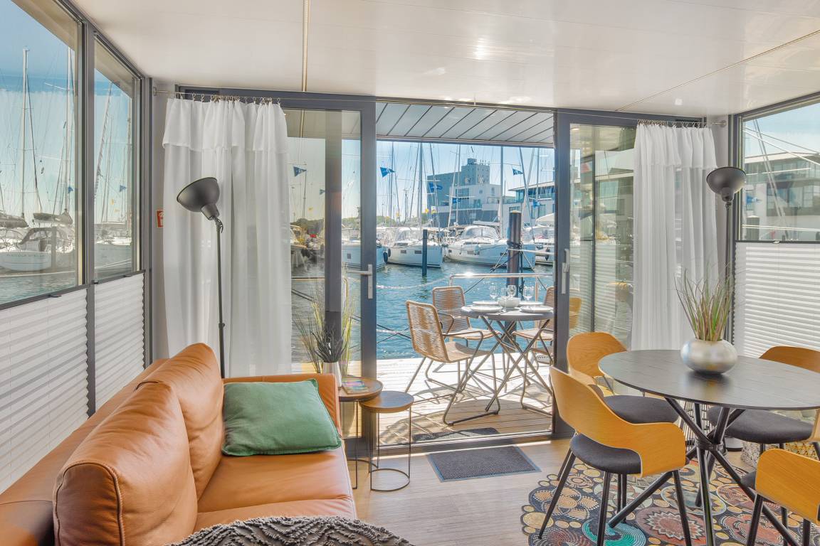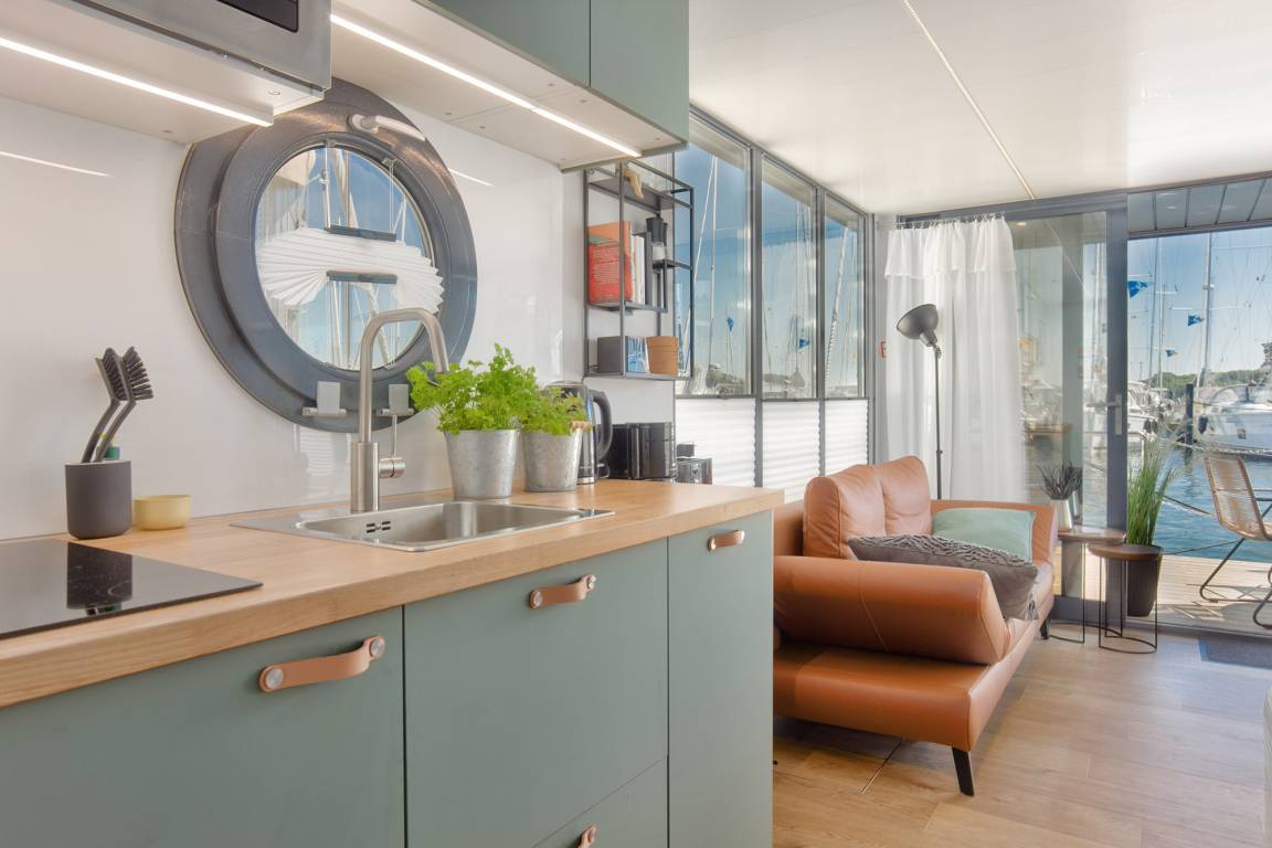 Das exklusive Hausboot Kleine Auszeit mit ca. 32 m² Wohnfläche, separater Bio-Sauna (bis 70°C) und zusätzlich eine möblierte Dachterrasse mit Strandkorb als Sonnendeck, verbunden über eine außenliegende Treppe. Der moderne und konzipierte Wohnbereich bietet Ihnen einen fantastischen Panoramablick über den Jachthafen und vom Sonnendeck über die Ostsee. Näher am Wasser kann man nicht Urlaub machen!