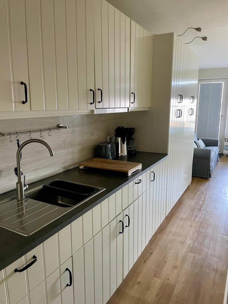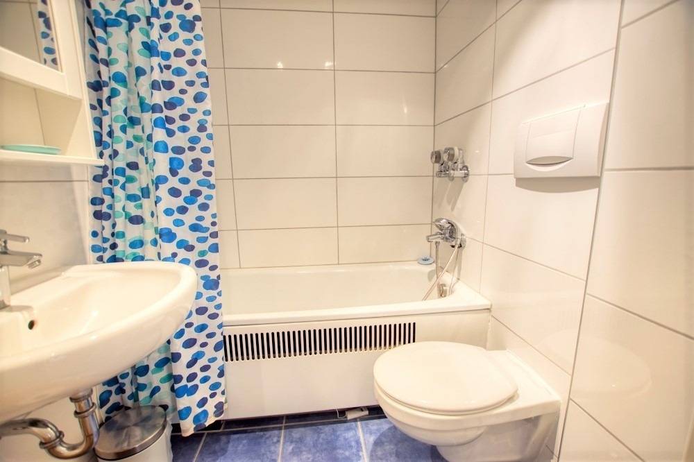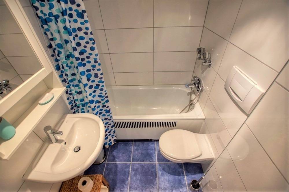 Ausstattung: Wohn-/Schlafbereich mit Doppelbett, Sofa, Flachbild-TV und Essecke am Fenster. Küchenzeile im Eingangsbereich mit Mikrowelle, Kühlschrank mit Gefrierfach, 2-Plattenherd, Wasserkocher, Filterkaffeemaschine und Toaster. Modernes Bad mit Badewanne und WC.