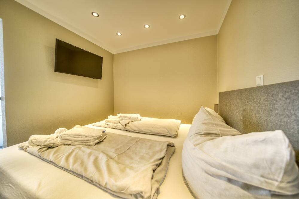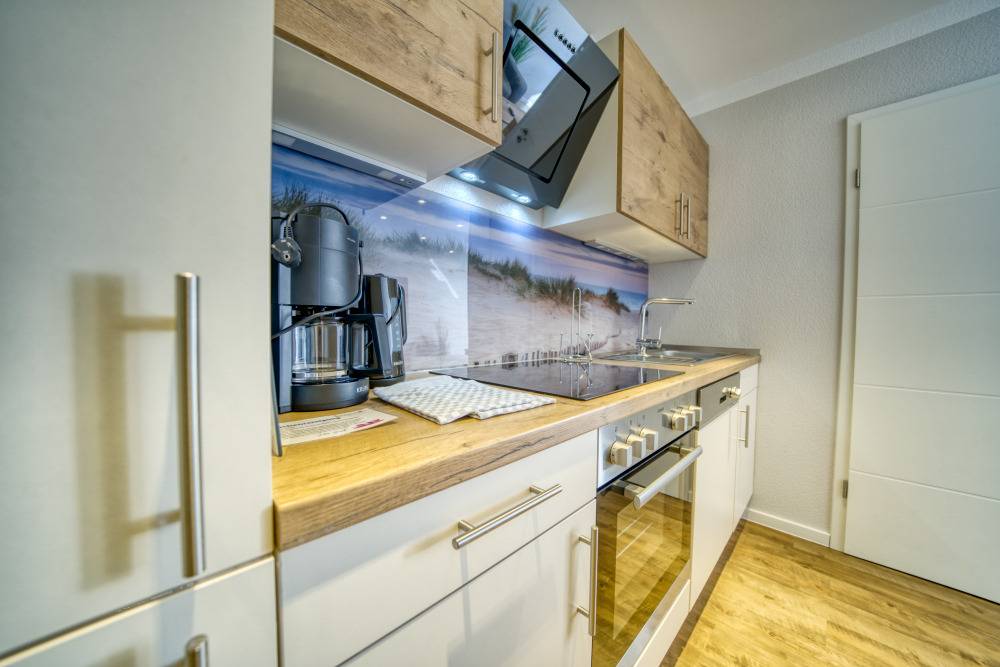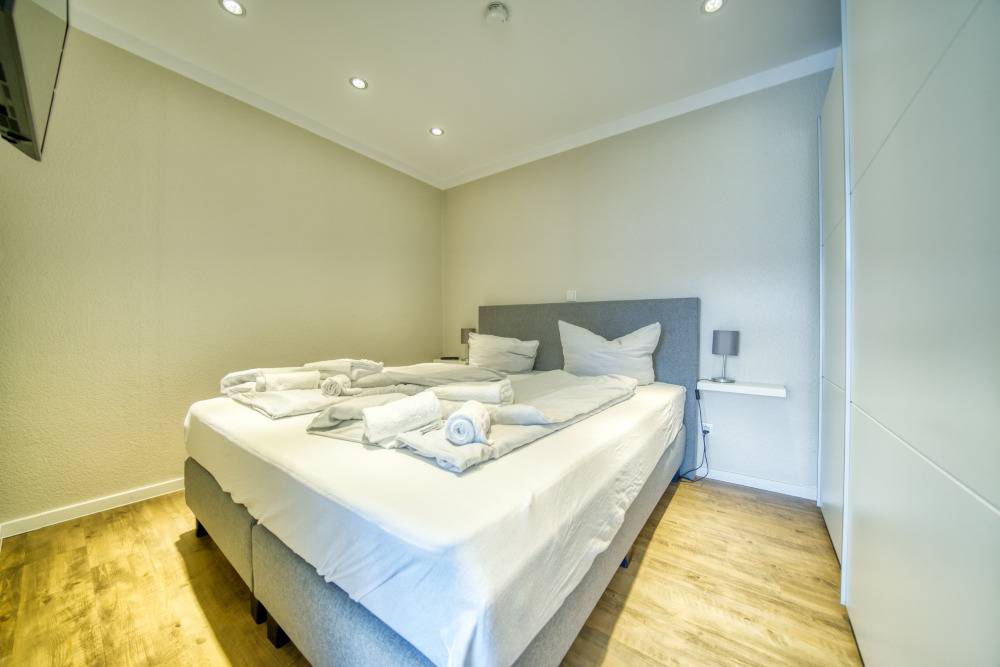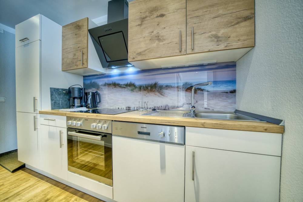 Die Wohnung verfügt über einen Elternschlafbereich mit Doppelbett und TV, ein Kinderzimmer mit Etagenbett, ein helles Wohn-/Esszimmer mit Sofa, Essecke und Flachbild-TV sowie eine voll ausgestattete Küche mit Ceranfeld, Geschirrspüler, Backofen, Kühlschrank mit Gefrierfach, Kaffeemaschine und Wasserkocher. Das moderne Bad ist mit großzügiger Dusche ausgestattet.