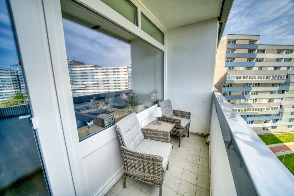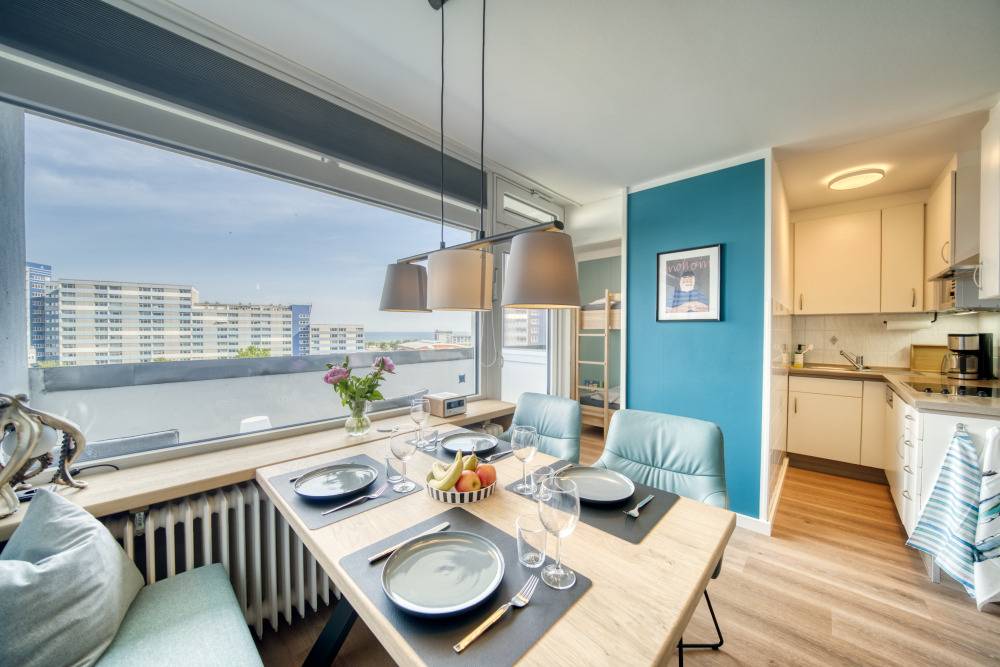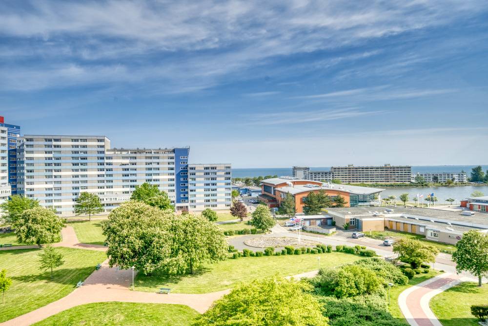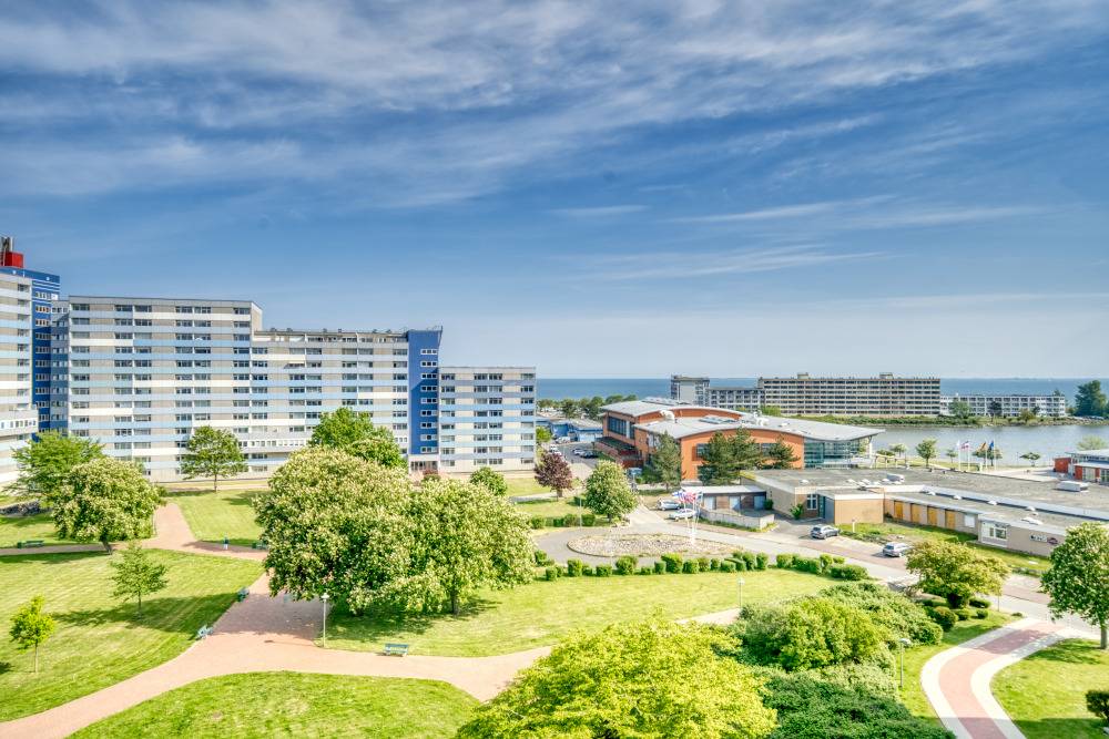 Willkommen in dieser lichtdurchfluteten Ferienwohnung in der 7. Etage des Hauses O im Ferienpark Heiligenhafen. Mit 45 m² Wohnfläche, traumhaftem Balkonblick über den Innenhof hinweg auf die Ostsee und den Binnensee, sowie durchdachter Raumaufteilung ist sie das ideale Domizil für einen erholsamen Urlaub mit bis zu 4 Personen.