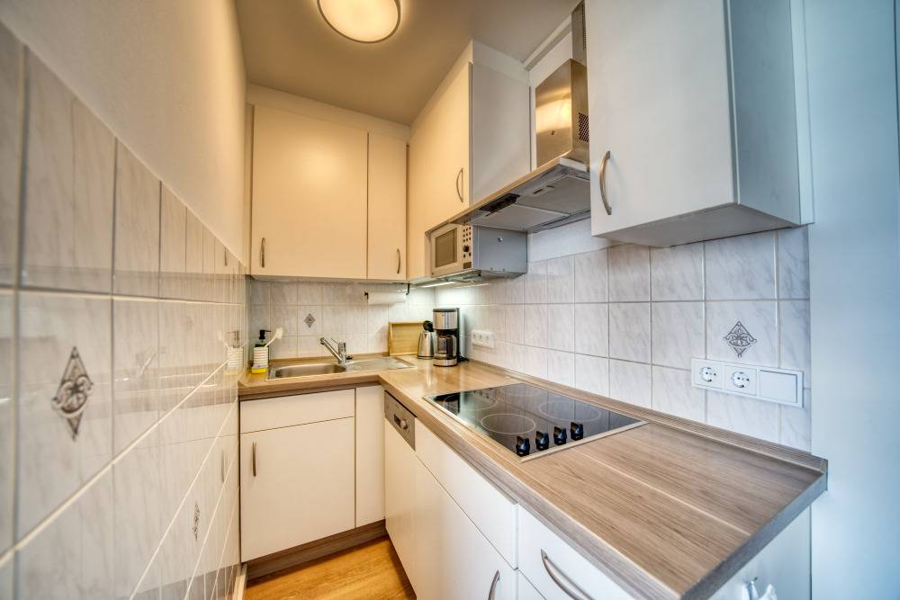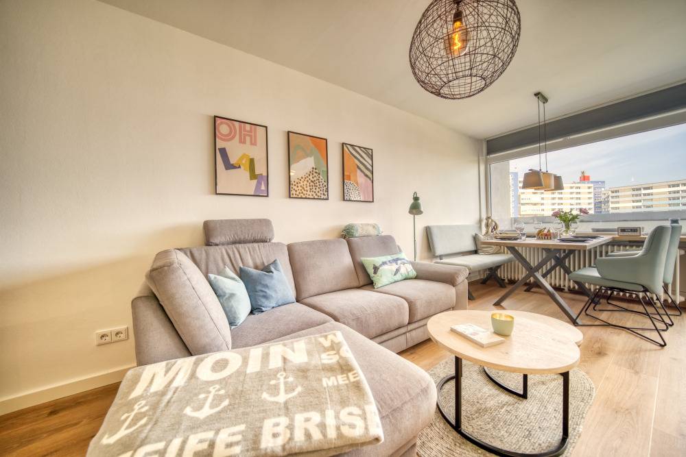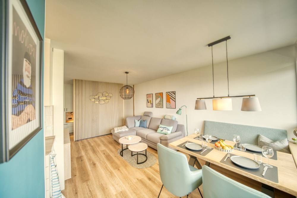 Die Wohnung bietet ein Wohn-/Schlafzimmer mit Doppelbett, separates Kinderzimmer mit Etagenbett, Wohnbereich mit Ecksofa, Esstisch und Flachbild-TV, sowie Küche mit Cerankochfeld, Mikrowelle, Kaffeemaschine, Wasserkocher, Toaster und Geschirrspüler. Bad mit Duschkabine, WC und Handtuchtrockner. WLAN, eigene Waschmaschine, Fahrstuhl, Fahrradräume und Parkplatz vorhanden. Nichtraucher, keine Haustiere. Ca. 300 m bis zum Strand. Aktiv-Hus mit Schwimmbad, Sauna, Wellness und Kinderspielwelt in der Nähe.