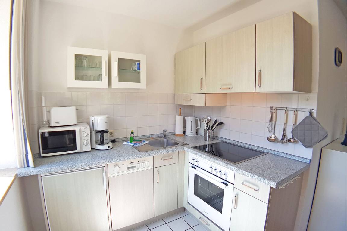 Das Apartment 9 im ersten Obergeschoss bietet auf etwa 50 Quadratmetern ausreichend Platz für bis zu vier Personen. Das Schlafzimmer ist mit einem Doppelbett und einem großen Kleiderschrank ausgestattet. Im Wohnbereich sorgt eine großzügige Schlafcouch für zwei weitere Personen für erholsame Nächte.