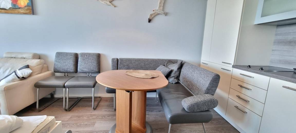 Die gemütliche Couch sowie eine Essecke laden zum Verweilen, Essen und Klönen ein.