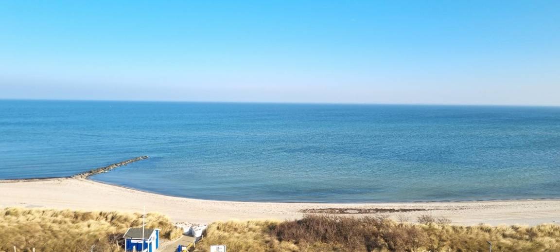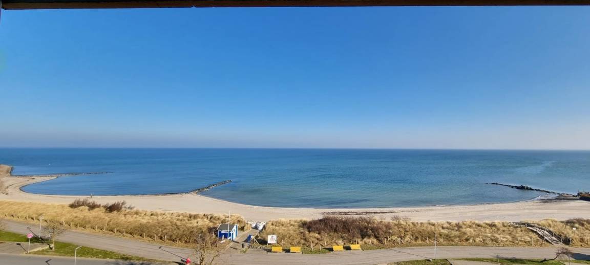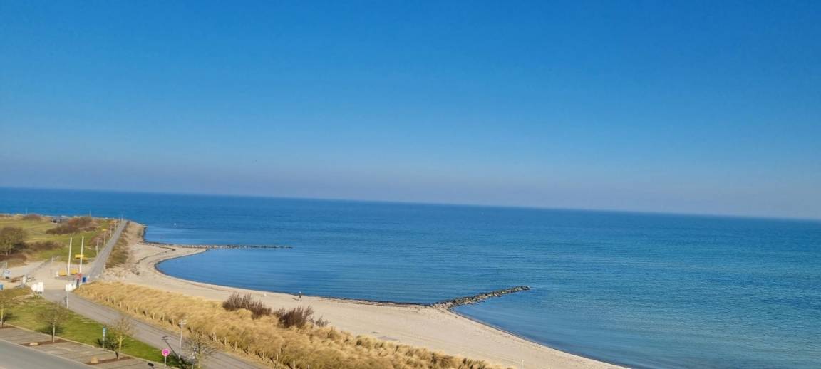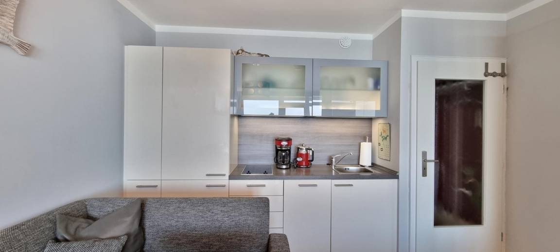 Ein absolutes Highlight ist der Balkon mit spektakulärem Ostseeblick, der an klaren Tagen sogar bis nach Fehmarn reicht. Hier können Sie den Sonnenaufgang bei einer Tasse Kaffee genießen oder den Tag entspannt ausklingen lassen. Die kompakte, moderne Küchenzeile ist funktional eingerichtet und verfügt über ein Induktionskochfeld, sodass Sie sich bequem selbst versorgen können.