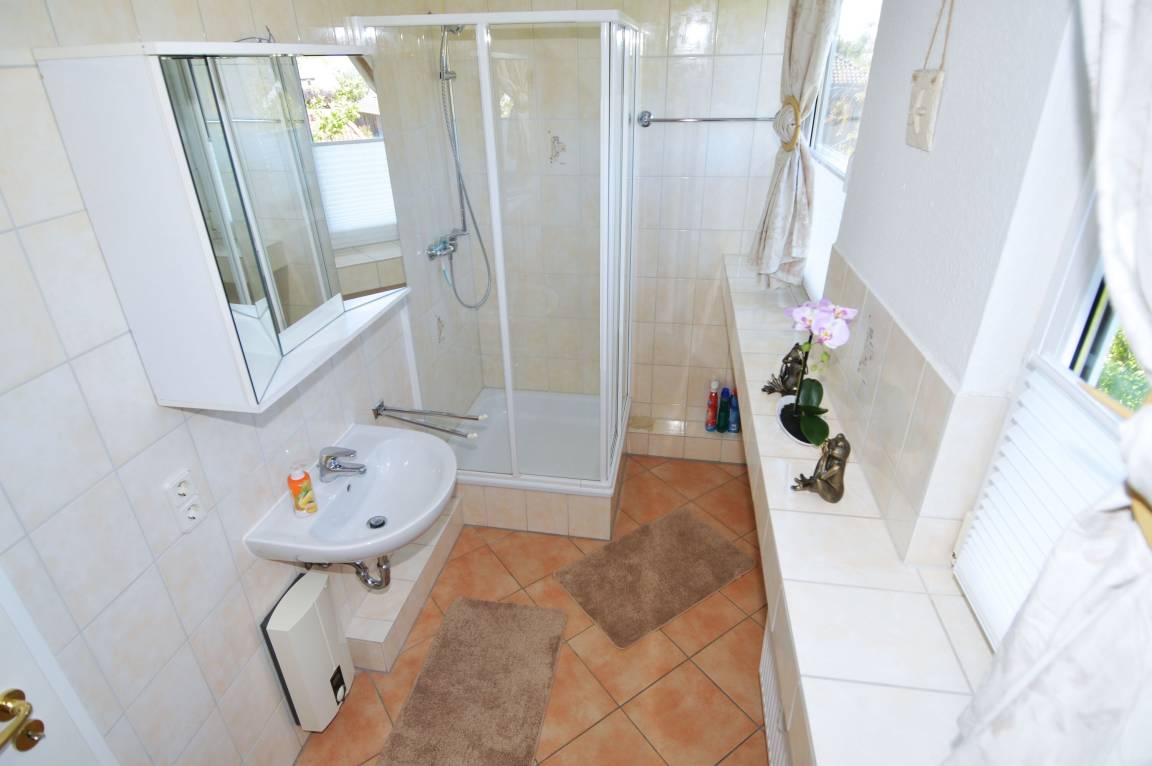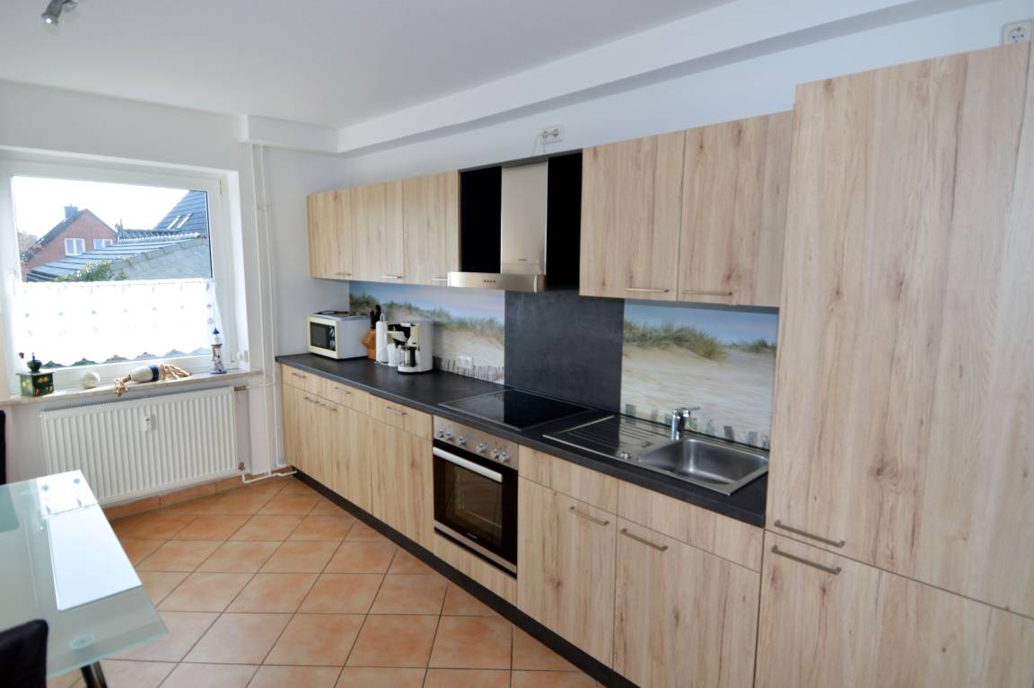 Die große, vollständig ausgestattete Küche verfügt unter anderem über Cerankochfeld, Backofen, Mikrowelle, Geschirrspüler sowie eine Kühl-Gefrier-Kombination und bietet viel Raum für die Selbstversorgung. Das Gäste-WC ist separat vom Duschbad gelegen und sorgt für zusätzlichen Komfort.
