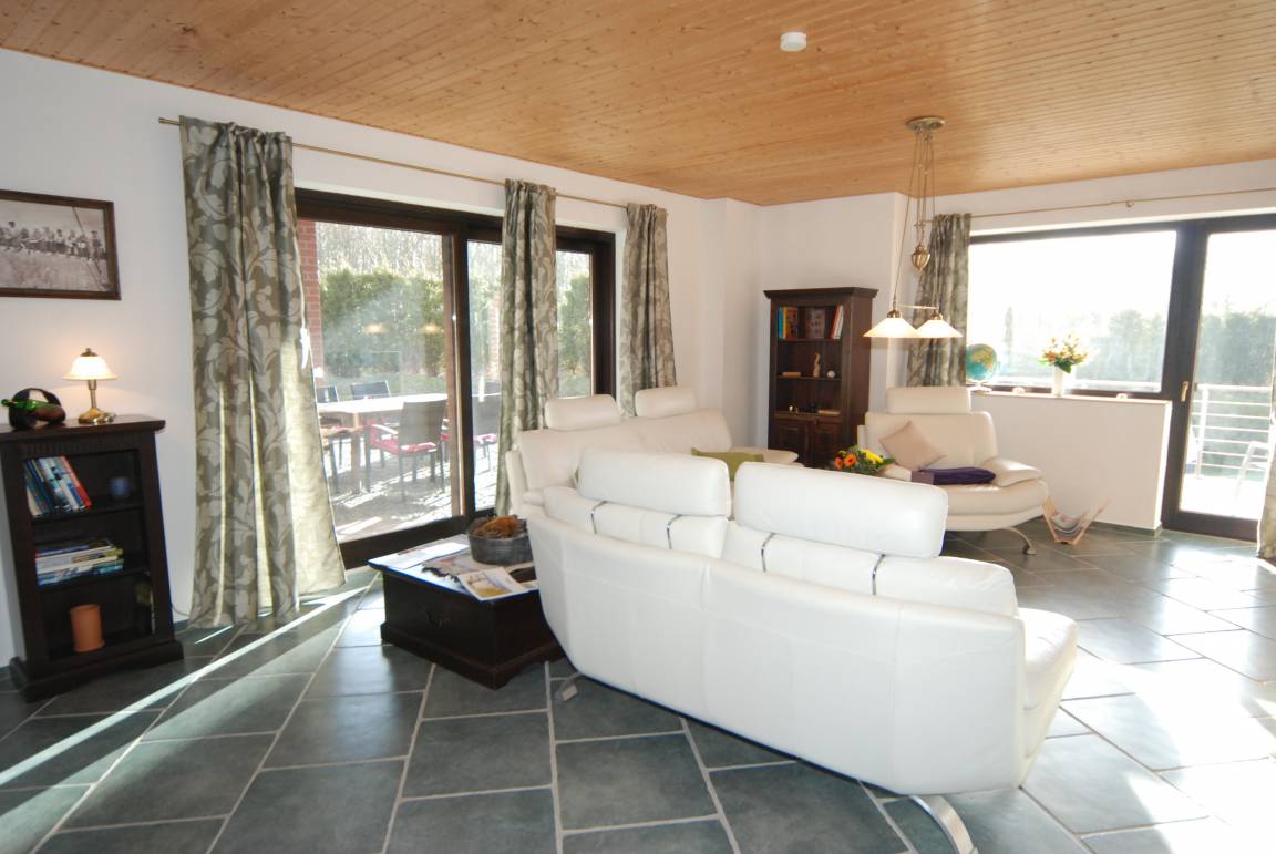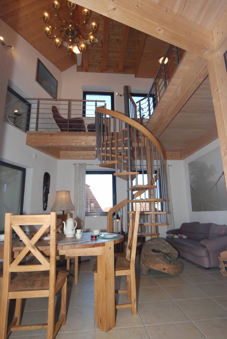Wir bieten für Ihren Urlaub in Heiligenhafen eine höherwertige Gesamtgestaltung mit gehobenem Komfort. Ansprechende Ferienwohnung mit einem aufeinander abgestimmten Gesamteindruck. In jedem Raum einzeln regulierbar Fußbodenheizung, die Möbel sind in Hartholz und vermitteln ein exklusives Wohlgefühl. Das großzügige Wohnzimmer mit 33 qm Wohnfläche ist ausgestattet mit Ledergarnitur, Flachbild, DVD, Safe, Stereoanlage. Wohnen zum Wohlfühlen und Relaxen. Durch den Essraum, offen bis in den Dachgiebel, führt eine Holzwendeltreppe in die Empore mit Bibliothek und einem Super-Panoramablick über die Dächer von Heiligenhafen auf die Ostsee, den Hafen, die Insel Fehmarn mit Fehmarnsundbrücke. Dort können Sie sich zum Lesen auf einen bequemen Ledersessel zurückziehen.