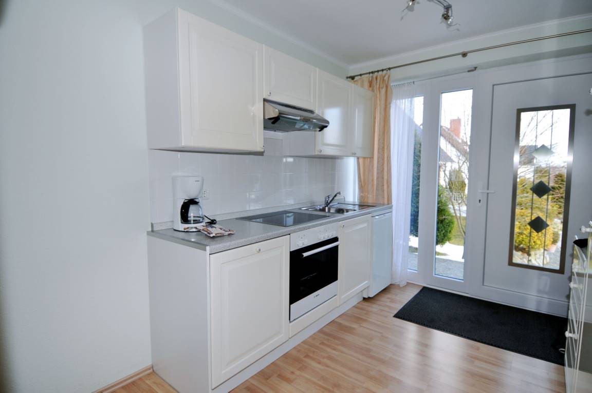Das separate Schlafzimmer bietet Ihnen ein komfortables Doppelbett sowie einen geräumigen Kleiderschrank und sorgt für erholsame Nächte nach einem aktiven Urlaubstag. Die helle Küche, die sich im Eingangsbereich befindet, ist funktional und vollständig ausgestattet. Neben einem Backofen und einem Geschirrspüler stehen Ihnen hier alle wichtigen Utensilien zur Verfügung, um sich im Urlaub bequem selbst zu versorgen.