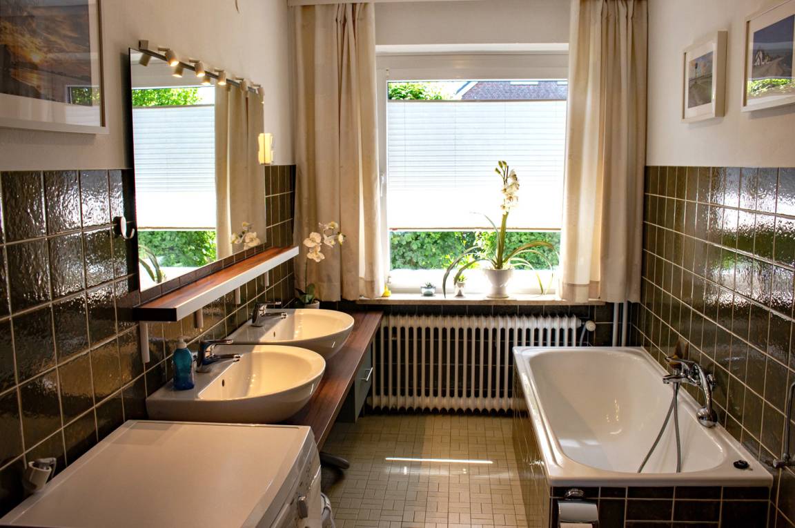 Das Badezimmer lässt keine Wünsche offen: Es verfügt über eine Dusche, eine Badewanne, ein Doppelwaschbecken sowie eine eigene Waschmaschine – ein echter Komfort, besonders bei längeren Aufenthalten oder nach ausgedehnten Radtouren.