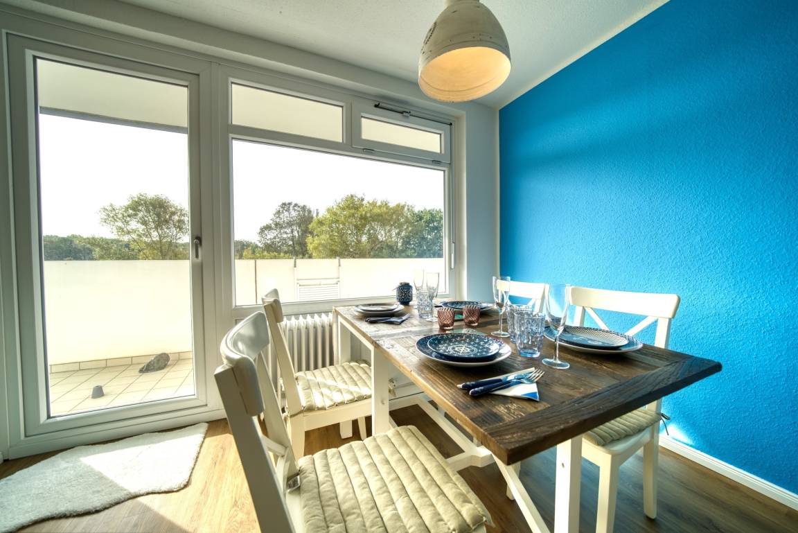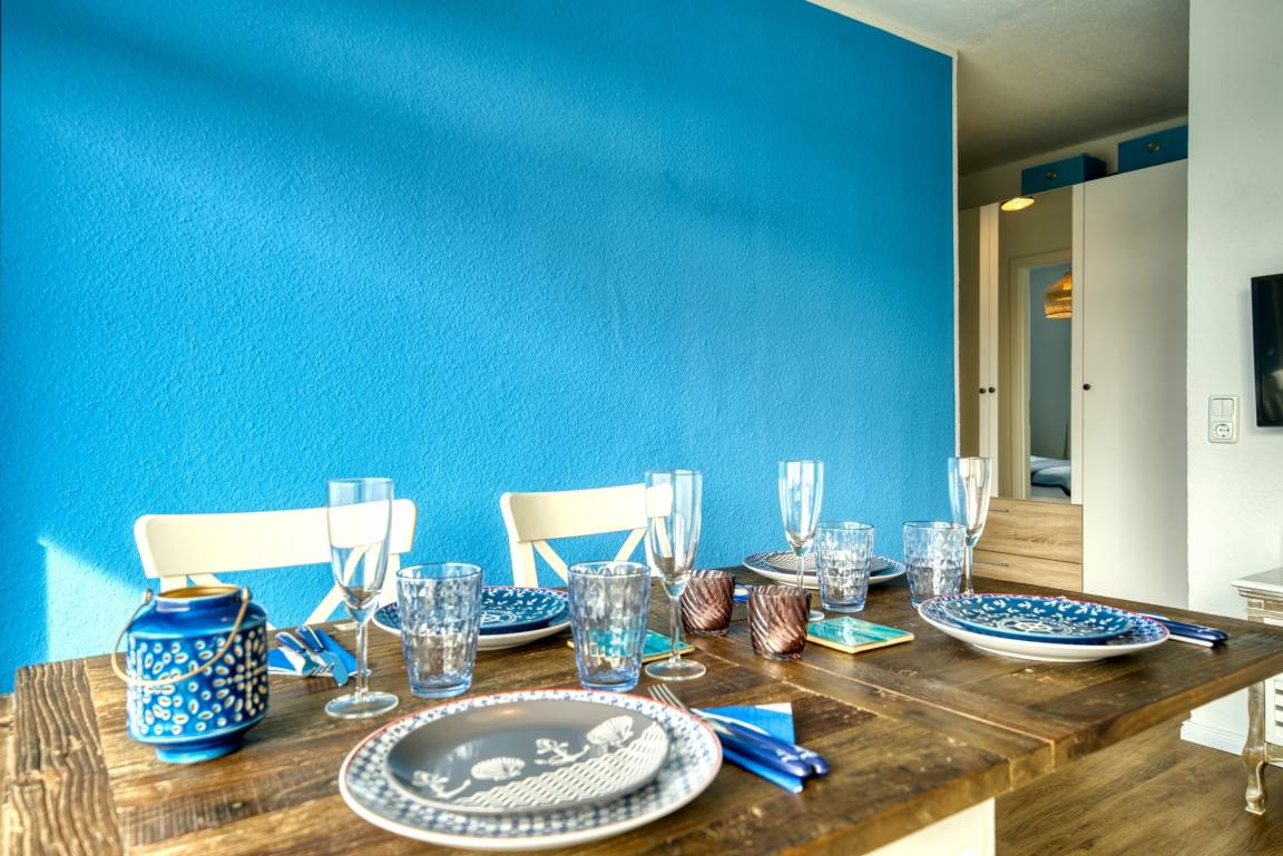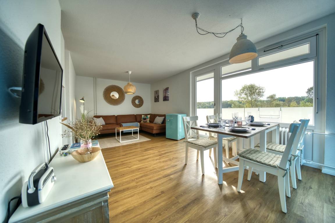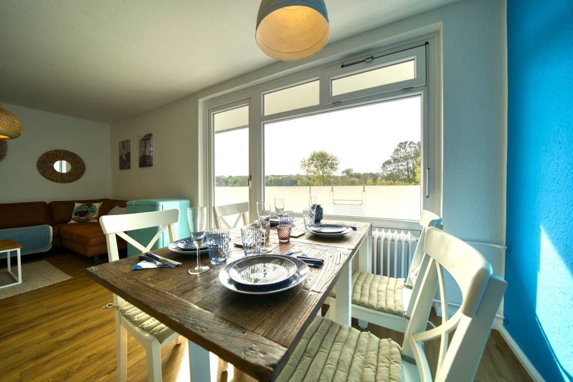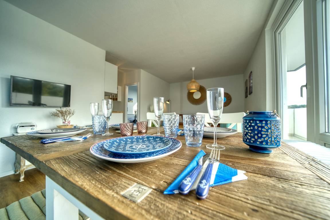 Lichtdurchflutete Ferienwohnung in Haus M, 1. Etage, 59 m², für bis zu 3 Personen. Offener Wohnbereich mit hochwertiger Couch, Flachbild-TV, Vinylboden. Schlafzimmer mit Doppelbett, weiteres Schlafzimmer mit Einzelbett. Großer Südwest-Balkon mit Blick auf Salzwiesen und Galloway-Rinder. Moderne Küche mit Induktionsherd, Backofen, Geschirrspüler, Kühlschrank mit Gefrierfach. Bad mit Duschkabine, Handtuchtrockner und Stauraum. Kostenloses WLAN. Nichtraucher, keine Haustiere, Fahrstuhl, abschließbare Fahrradräume, kostenfreier Parkplatz. Strand ca. 300 m. Aktiv-Hus mit Schwimmbad, Sauna, Wellness und Kinderspielwelt in unmittelbarer Nähe.
